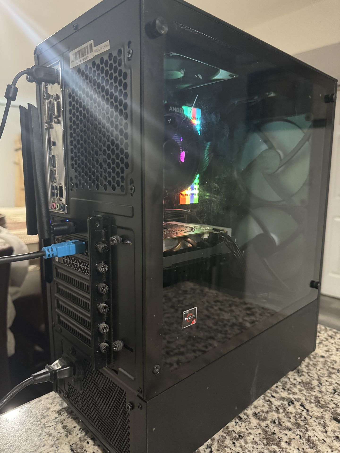Graphics card: gtx 1660 OC CPU: Ryzen 5 2600x Ram: 32gb ddr4 Storage: 1tb ssd Motherboard: Asrock ProM 4 PSU: Semi modular 650w Corsair * 4 120mm cooling fans * Stock Ryzen cpu cooler * Phanteks Case * Windows 11 Pro (Free version with watermark) * The motherboard doesn’t have bluetooth or wireless wifi but I added a bluetooth adapter and a wifi adapter for speeds up to 5400mbps. I recently replaced the thermal paste for both the cpu and the gpu so you shouldn’t have problems with overheating and the entire pc was also recently deep cleaned so there shouldn’t be any dust inside. All the cooling 120mm cooling fans are either brand new or fairly new aswell. I have a small library of games that I can test if asked for benchmarks. (If i have the game) I also have a small 75hz monitor that I’ll throw in since i don’t need it anymore. All cables included: hdmi, power cord, ethernet cord, and the cords for the monitor if wanted. The only thing that bothers me is when I install games the internet speed fluctuates alot but it might just be my wifi. Overall a good well taken care of pc that would be good for starting off on pc games.