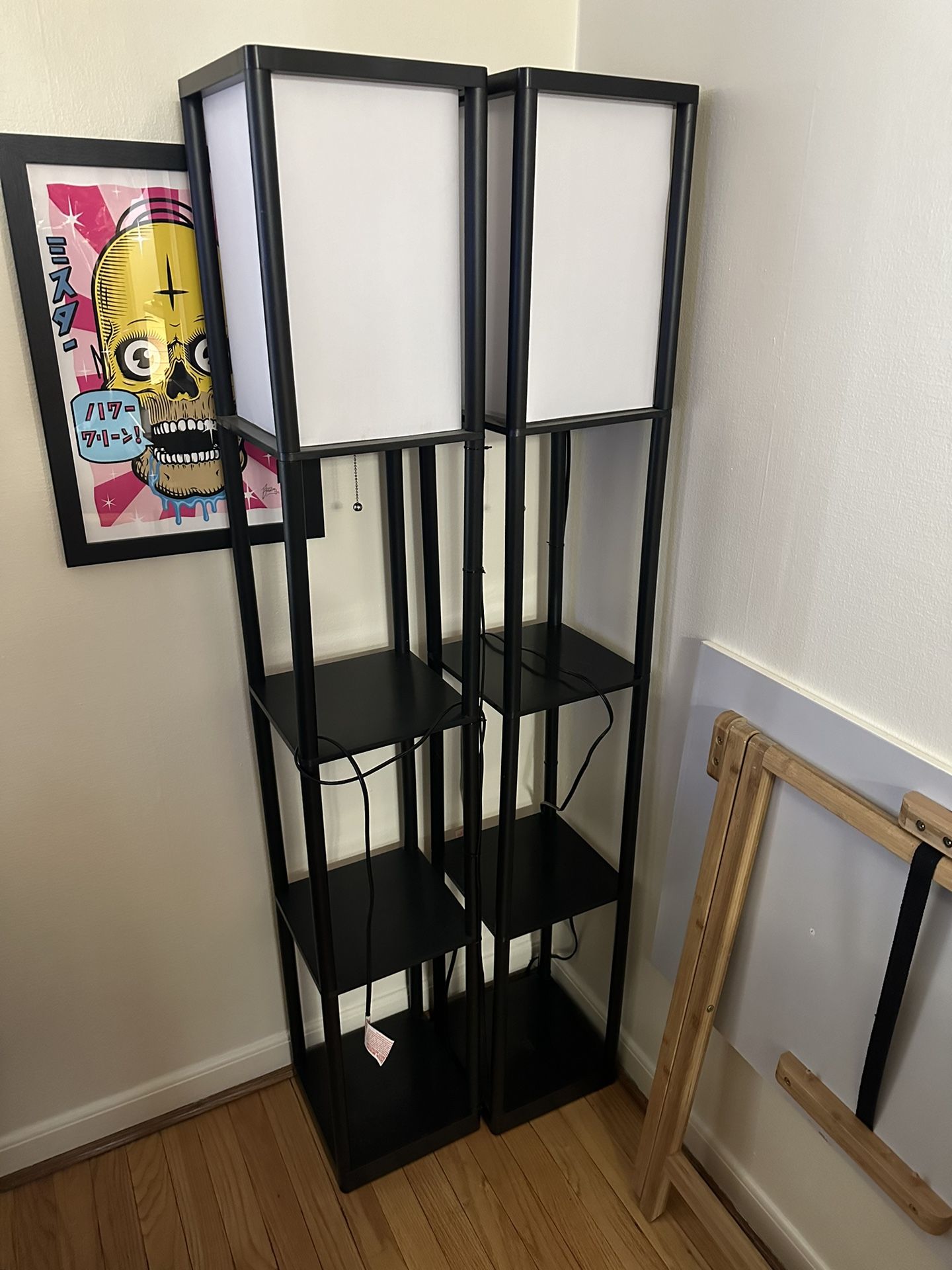 2 lamps with 3 tier shelves. Lightweight made of plastic but they look nice. Must come to me to pickup no deliveries $30 for both