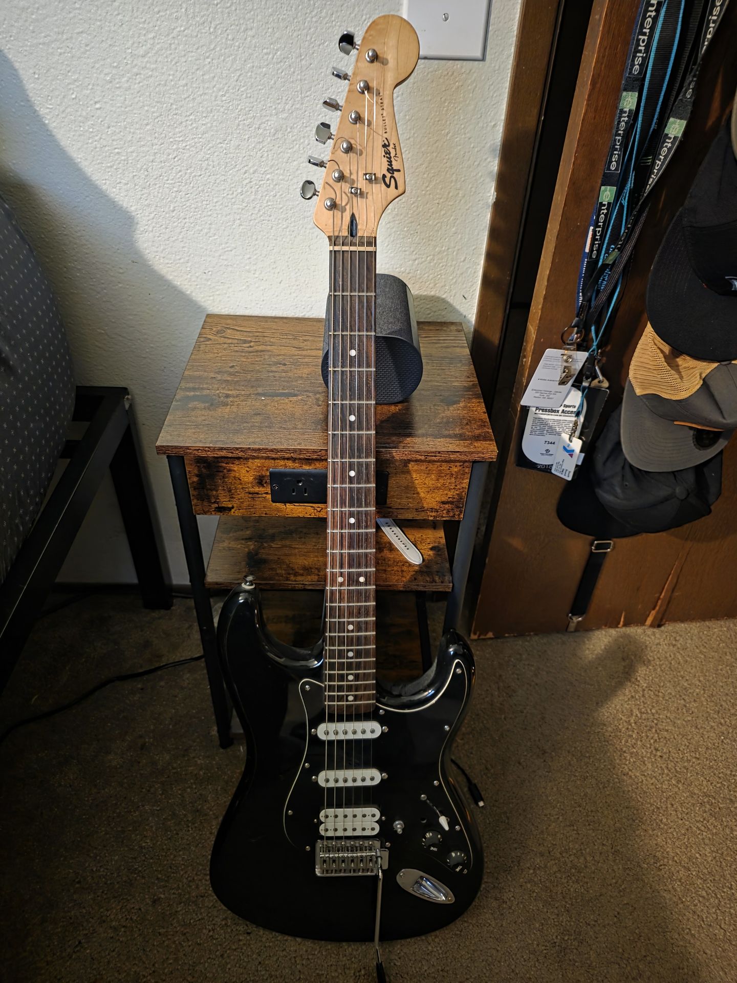 Fender squire bullet black this was my main guitar for many years it has some dings and dents scratch plate has been replaced still functions and operates fine $50