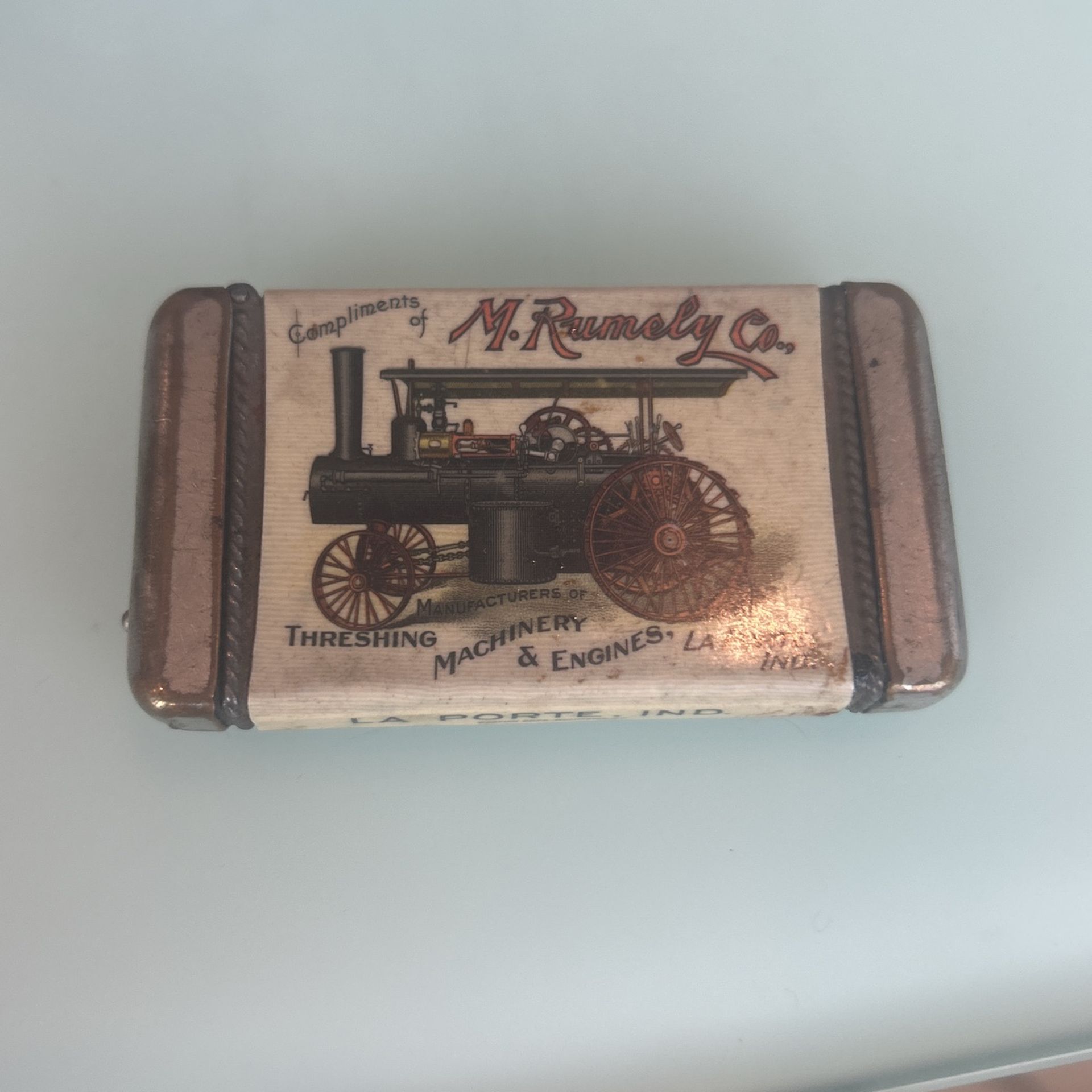 Vintage M. Rumely Co. celluloid match safe