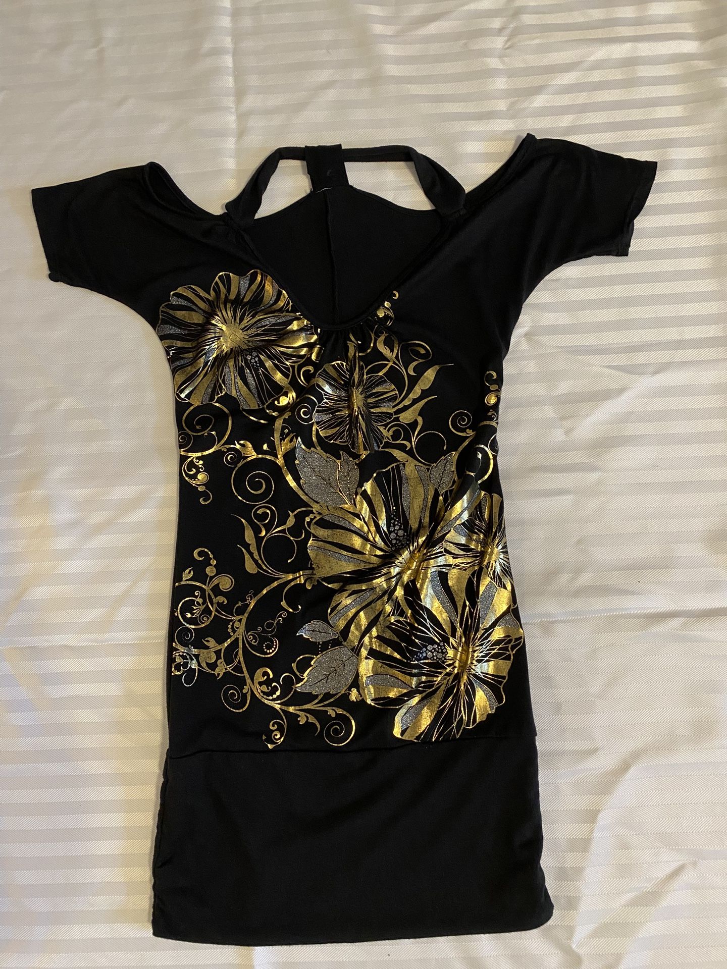 Beautiful black, gold and silver blouse. Very sparkly but not shown much in pics. Spandex material. Can be worn long or folded at the bottom
