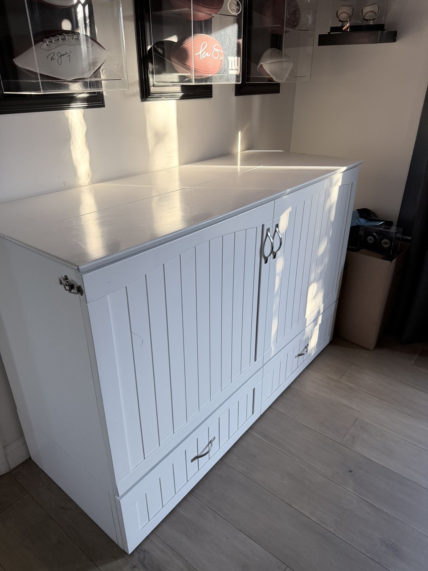 Cabinet with an enclosed queen sized bed. Perfect for an office or guest room. The cabinet converts to a queen size bed. It is in very good condition and only slept on a few times. The mattress is surprisingly comfortable. Cabinet measures: L: 5’2” W: 2’ H: 3’5” Note the cabinet is very heavy and has the mattress inside. You will need several people to move this and potentially a dolly and/or moving equipment along with a truck or trailer.