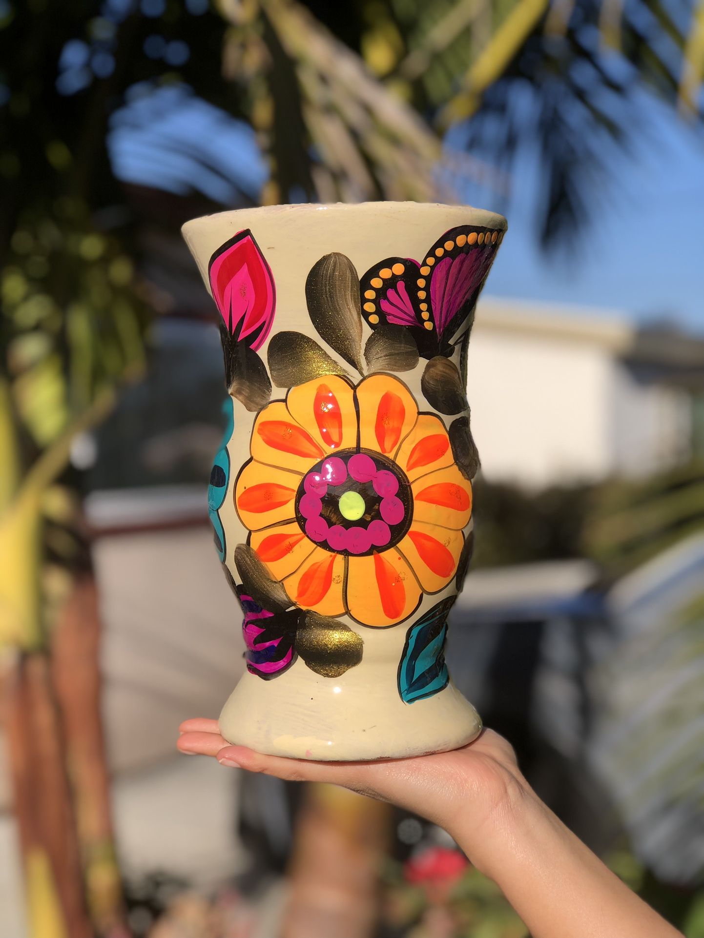 This vase’s uniqueness is showed through its light cream brown base, followed with beautiful vibrant flowers and vibrant butterflies. What makes it more unique than what is looks like is the golden green leaves with added shimmer to it and on-top of that are vibrant flower buds. This vase especially comes from Oaxaca, Mexico. Handcrafted, handmade, and hand painted. Each painting brings both a delicate and bright artwork, this reflects joy and cultural richness of Oaxaca. Placed on a wooden shelf, a dining table, or near a window it will create a striking focal point. This not only is a beautiful home decor for flowers but can also be a really thoughtful gift! Measurements: Height-9in Middle- 5in Width- 6in