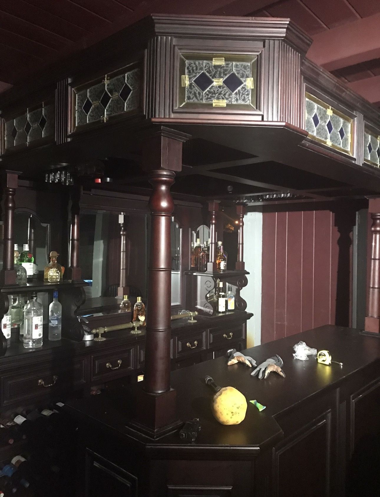 Custom Bar imported from Indonesia. In decent condition. Not for a small space as it takes up easily half a room. Disassembles in 4 pieces and is made of solid wood. It’s about 94 inches high assembled. Comes with wine cooler.