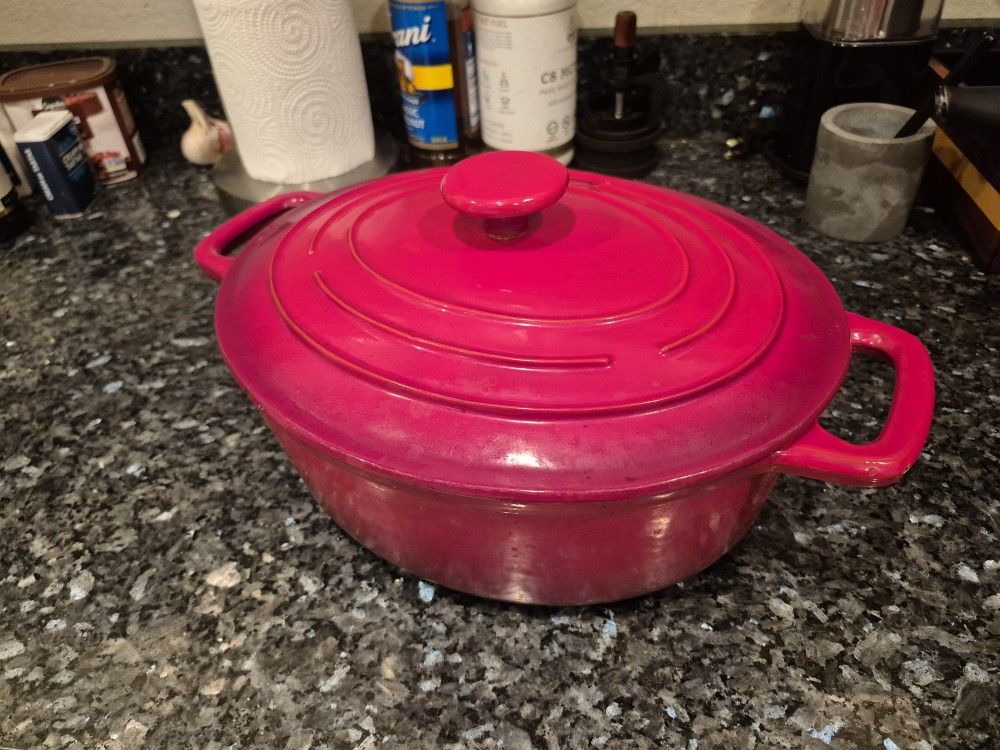 Used cast iron oval Dutch oven. It is a Le Creuset knock off. Works great but got a new one for Christmas. Totally great for new cooks or expanding your kitchen! Obviously used, please see pictures