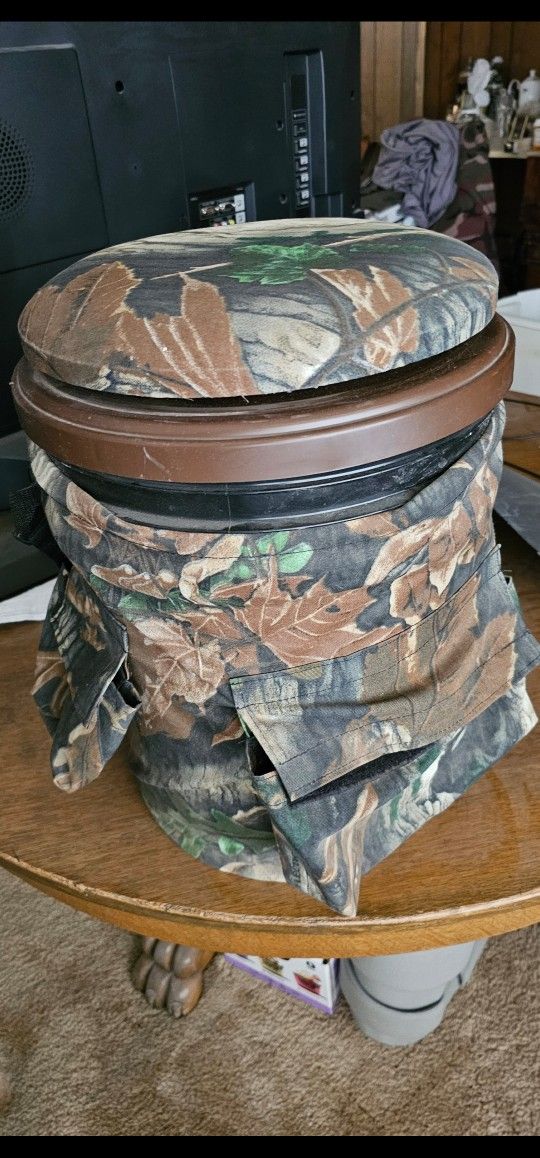 Camouflage ice cooler about 18 inches tall about 11 inches wide. Rotating seat cushion. Styrofoam lined