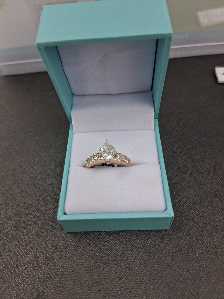 Come on down to 3809 Shaver and see this beautiful ring for that special person in your life. It is a beautiful 14k solitaire ring that weighs 3.90 grams and is a size 7.5, that consists of 6-15pt Princess cut diamonds. Also 2-25pt Diamonds and 2-10pt Diamonds.