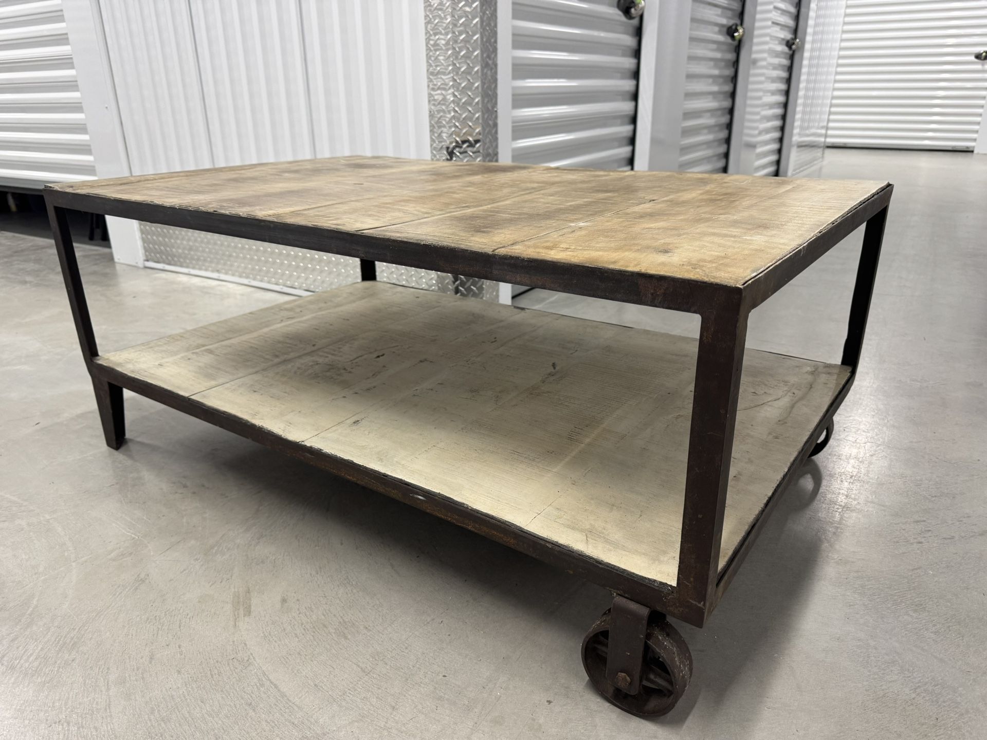 Used , in good / solid condition, rustic rectangular coffee table. Solid wood / metal base with 2 wheels . Please check all pictures. Dimensions: 48” x 30” x 20” high Price :$80 cash only Pick up in Itasca zip 60143 Delivery possible for a small fee