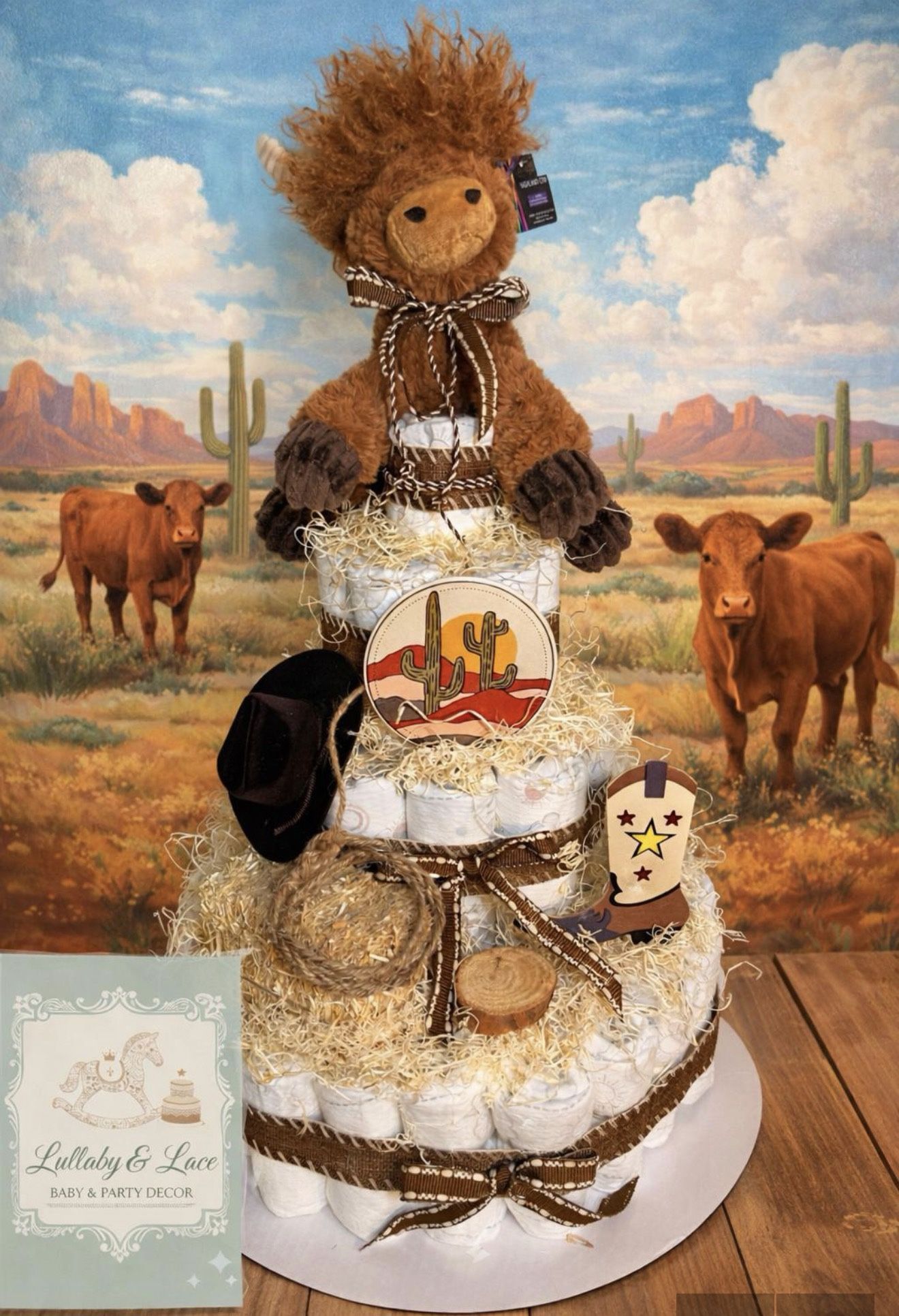 Product Details • Theme: Cowboy, Rodeo, Western. • Number of Tiers: 3 • Diaper Brand: Pampers Swaddlers • Diaper Size: Size 2 (7 diapers) Size 3 ( 15 diapers) Size 4 ( 41 diapers) • Total Diaper Count: 63 • Color Palette: Brown, Beige, Orange. • Occasion: Baby Shower / Gender Reveal / New Baby Gift & What's Included • Premium quality diapers • Decorative ribbons and embellishments • Coordinated themed accents • Fully assembled diaper cake • Ready-to-display upon arrival # Perfect For • Baby shower centerpieces • Baby boy or baby girl showers • Gender reveal celebrations • Unique new baby gifts • Nursery or event décor ** Quality & Care All diaper cakes are created in a clean, smoke-free environment.