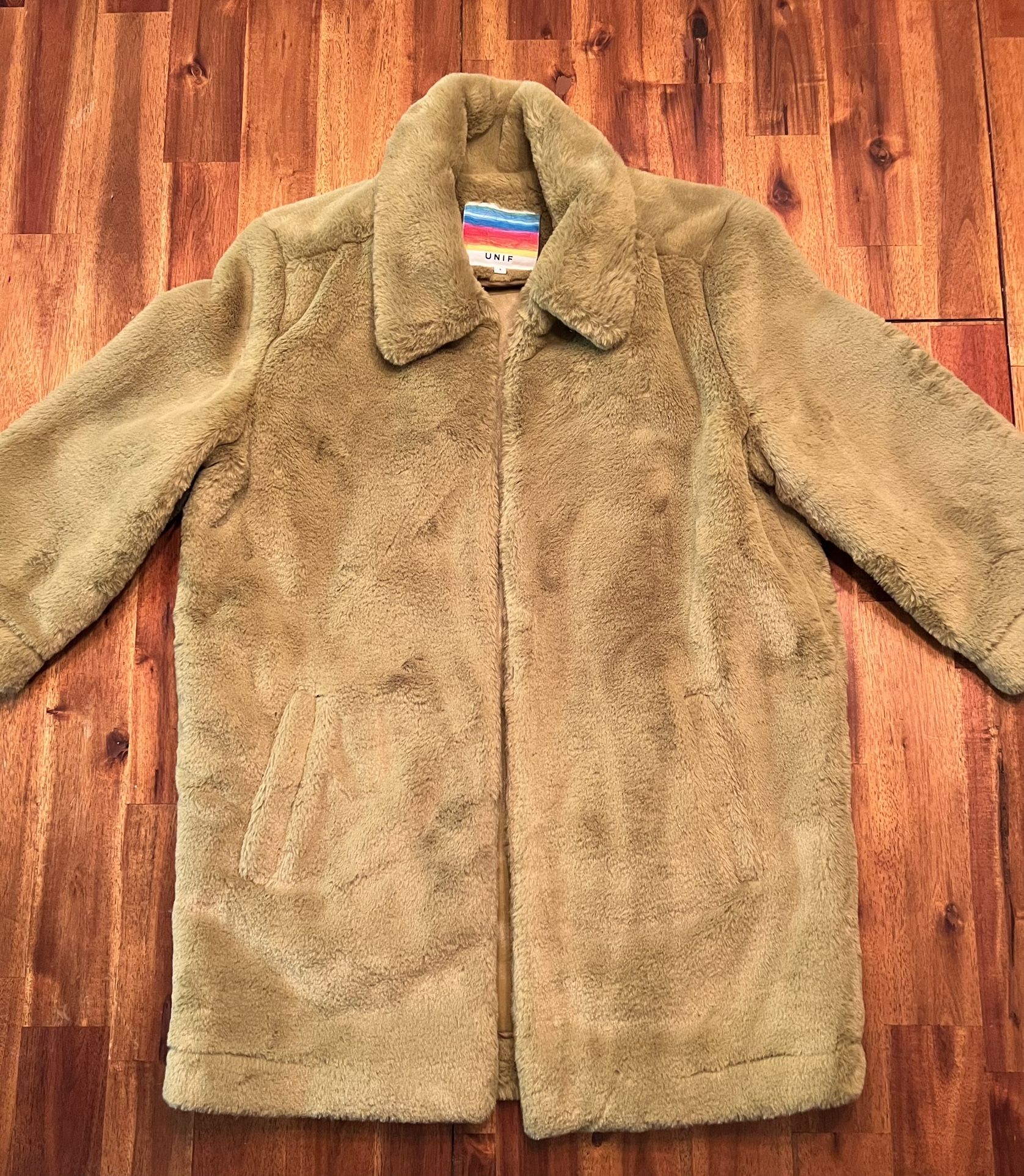 UNIF Green Fuzzy Coat Info: Size S 100% Polyester Lining 100% PU Leather Dry clean only Made in China Unif Green Fuzzy Jacket circa 2018. Features two front pockets and 3/4 sleeves. Basically brand new condition and is a great addition to any fashionable person!