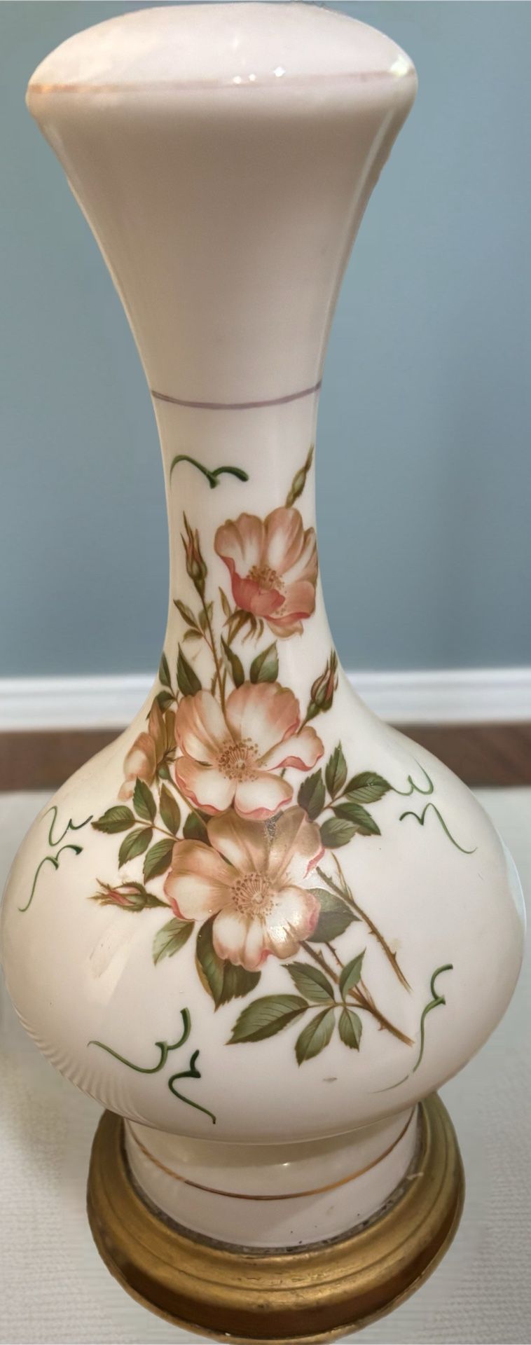 This is in perfect condition, they have more fall colors that has been hand painted the sweet dogwood flowers it works great , 26" to the top of the original harp. Base is 6.5" wide. Brass finial shown is included but no shade is included with this lamp cash only local pickup