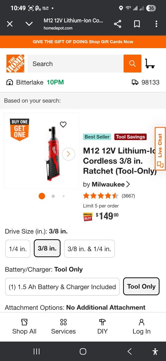 Milwaukee M12 3/8” Cordless Ratchet – Tool Only $100