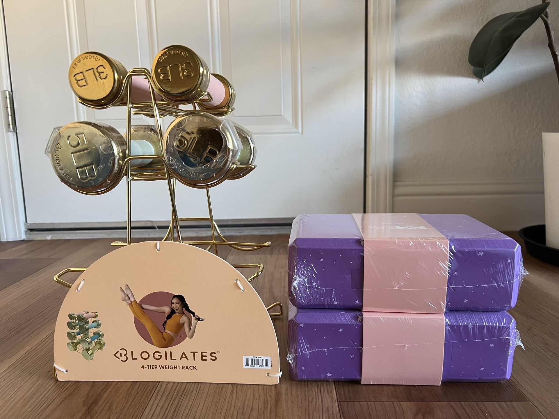 Home workout and yoga equipment by Blogilates - brand new, never used. - 3 lb cute gold weights $20 - 5 lb cute gold weights $20 - Gold stand for weights $15 - 2 yoga blocks $15