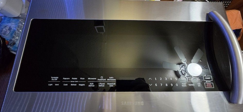 Samsung 2.1 cu ft Over-the-Range Microwave with built-in vent and PowerGrill. Fully working . Heats water quickly. All buttons and fan work properly. Stainless steel finish. Interior cleaned. Mounting bracket and top bolts not included. Perfect replacement if you already have existing hardware. Ready for pickup.