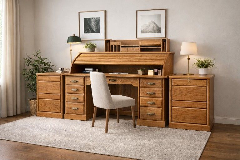 Solid Oak Roll-Top Executive Desk + 2 Matching File CabinetsBeautiful solid oak roll-top desk with two matching file cabinets — a complete executive o