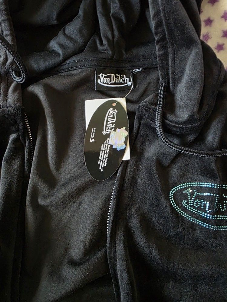 New Black Von Dutch Tracksuit with blue rhinestones logo, sizes available S,M and L