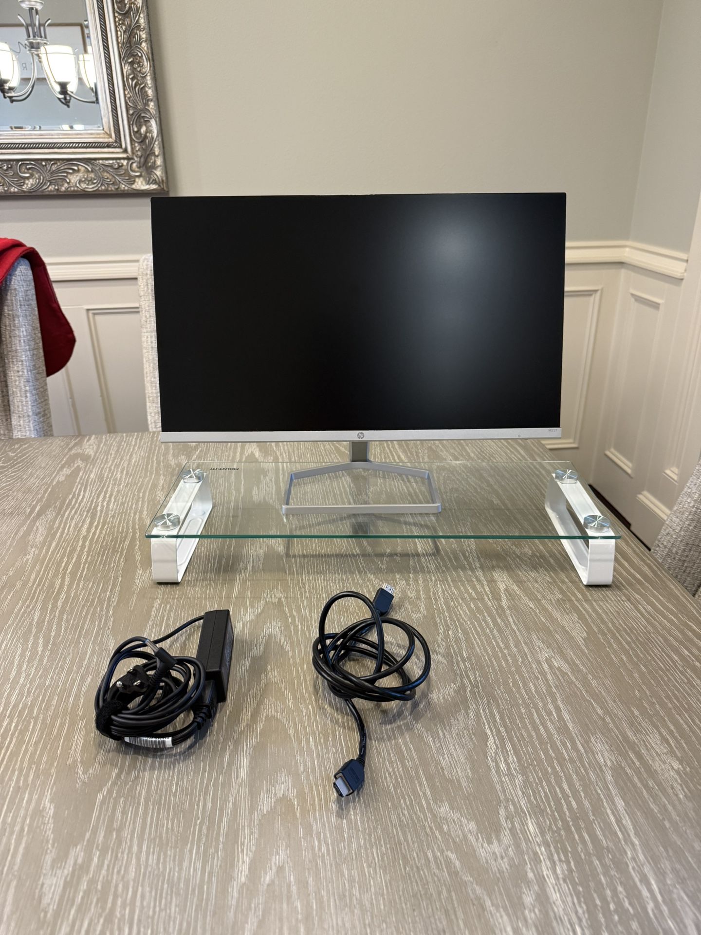 HP M22f FHD Monitor + Glass Monitor Stand (Like New) Selling a like-new HP M22f Full HD monitor that works perfectly. It’s been barely used and is in excellent condition. Included in the setup: • HP M22f FHD Monitor (1080p, slim design) • HDMI cable • Power cable • Modern glass monitor stand (Mount-It brand) The monitor stand has a non-slip base, so once it’s placed, it stays put — no sliding around. Super sturdy and great for gaming, schoolwork, or a clean desk setup. The raised stand also helps with better posture and desk organization. NO SCRATCHES OR PIXEL ISSUES. Like I said works like new!!! I used it for a few weeks, but don’t need anymore. Everything is tested and ready to plug in and use. Great setup if you want something clean, simple, and reliable. Message me if you have questions or want to pick up 👍