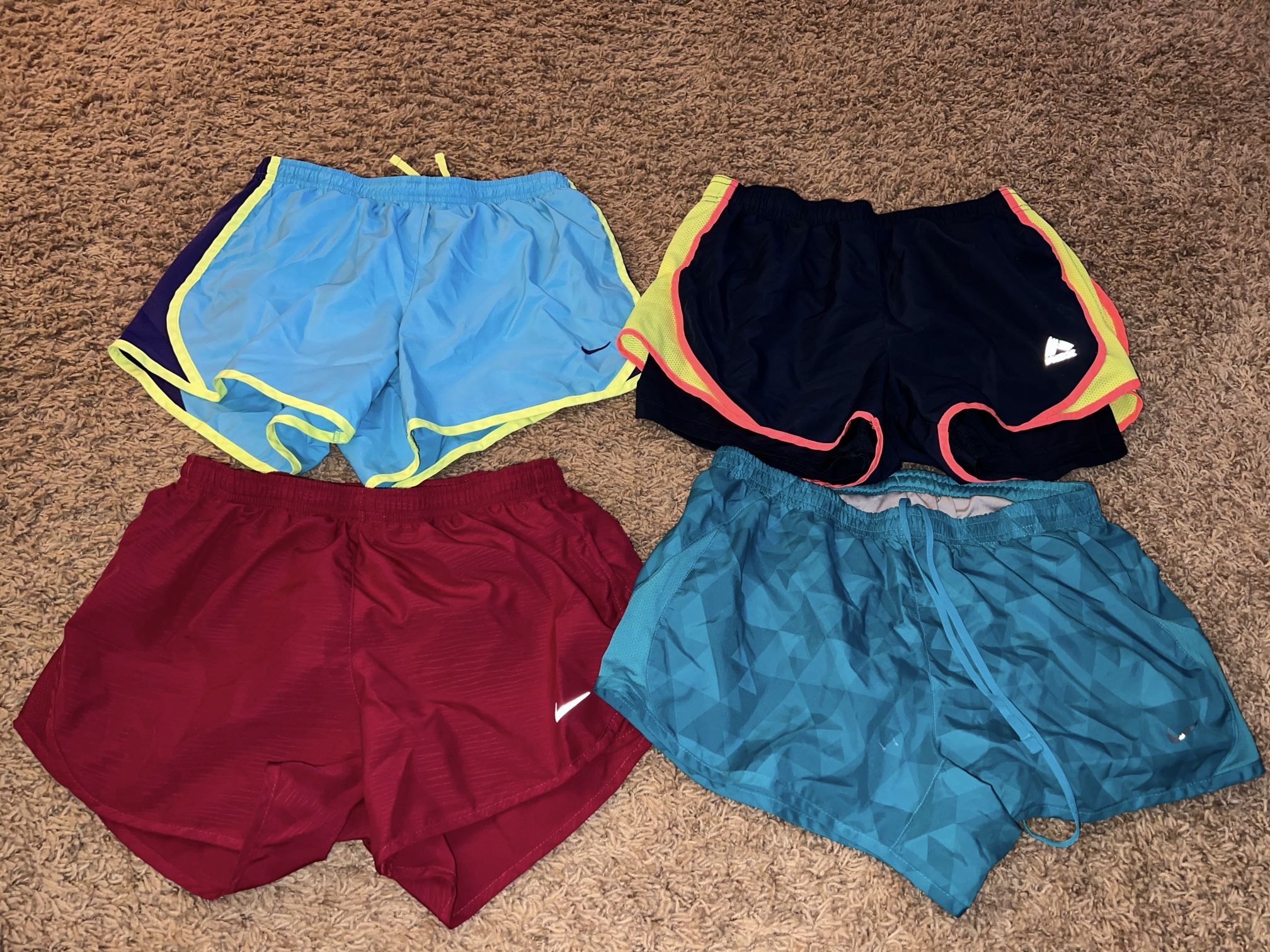 all are nike except navy. pink- xs blue- small yellow and blue- large in youth navy- small