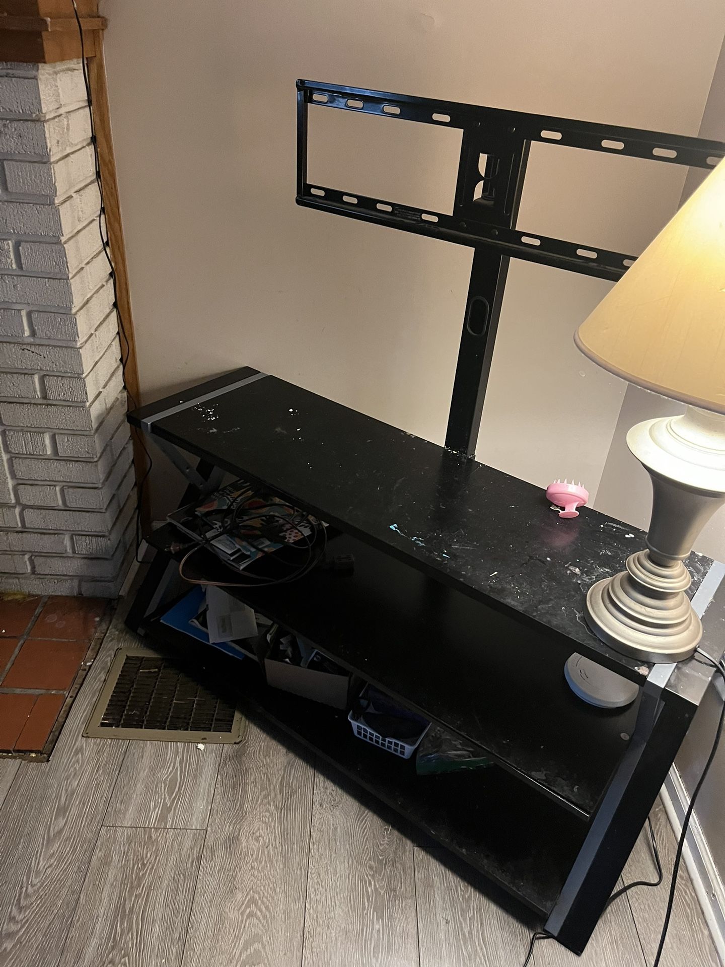 Black metal TV stand has integrated mounting bracket for flat screens. Unit includes two open shelves for storage and media devices. Frame is sturdy metal