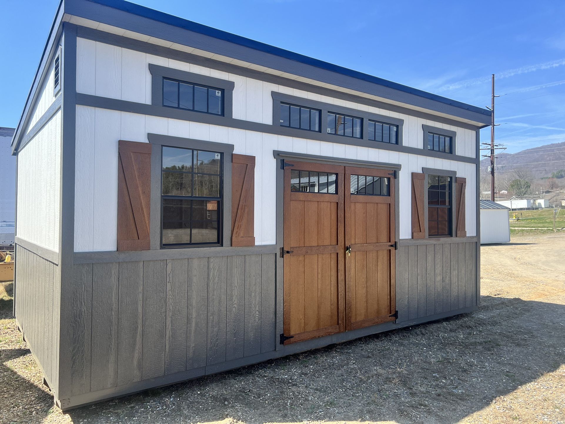 12 x 20 studio style Dual color, electrical package, seven transom windows, two 2 x 3 windows, and warranties included. First 30 miles included for delivery . 5 to 7 day delivery No credit check payment options available