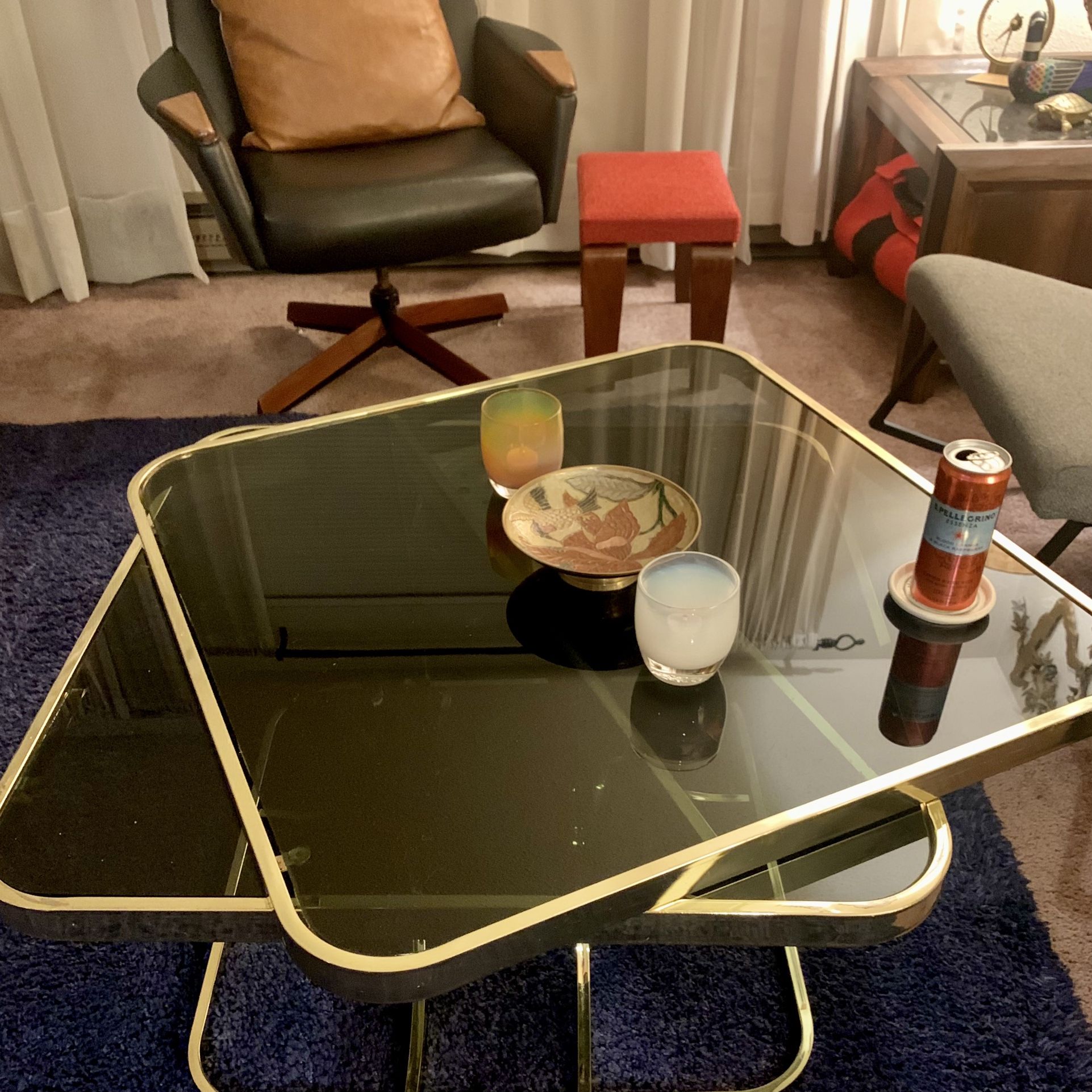 🤩 A stunning Vintage MCM brass and smoked glass coffee table! Spins 360 degrees to accommodate any seating you desire. Nice heavy high quality piece in the style of Milo Baughman. Good condition and rotates effortlessly. 36ʺW × 36ʺD × 17ʺH
