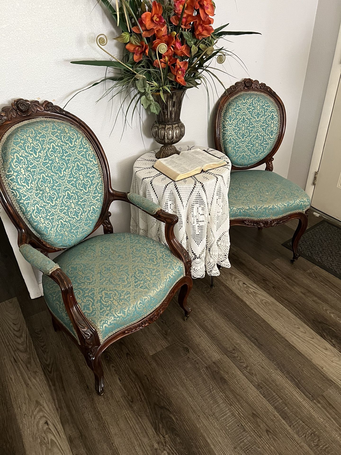 Antique furniture up for sale the loveseat, knees reupholster on the bottom small rip other chairs not too shabby perfect for person trying to restore antique furniture