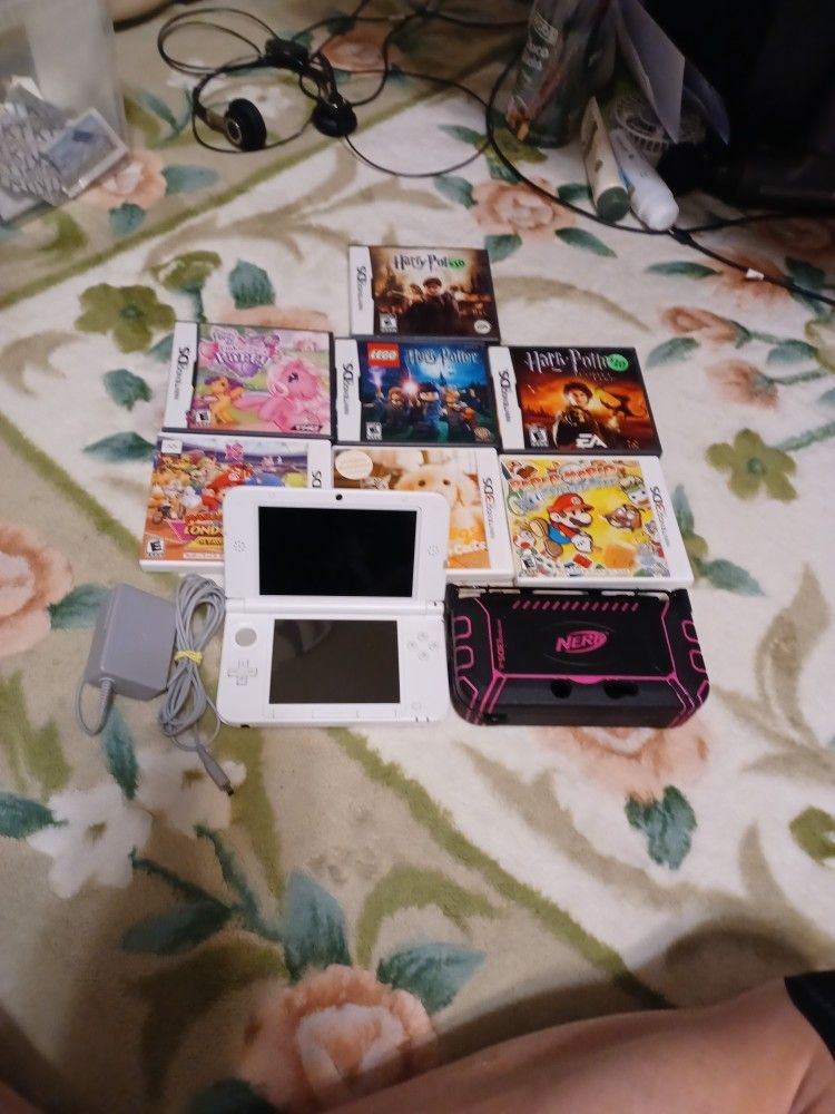 Nintendo 3DS XL Pink & White System With Charger And 3 3DS Games And 4 DS Games