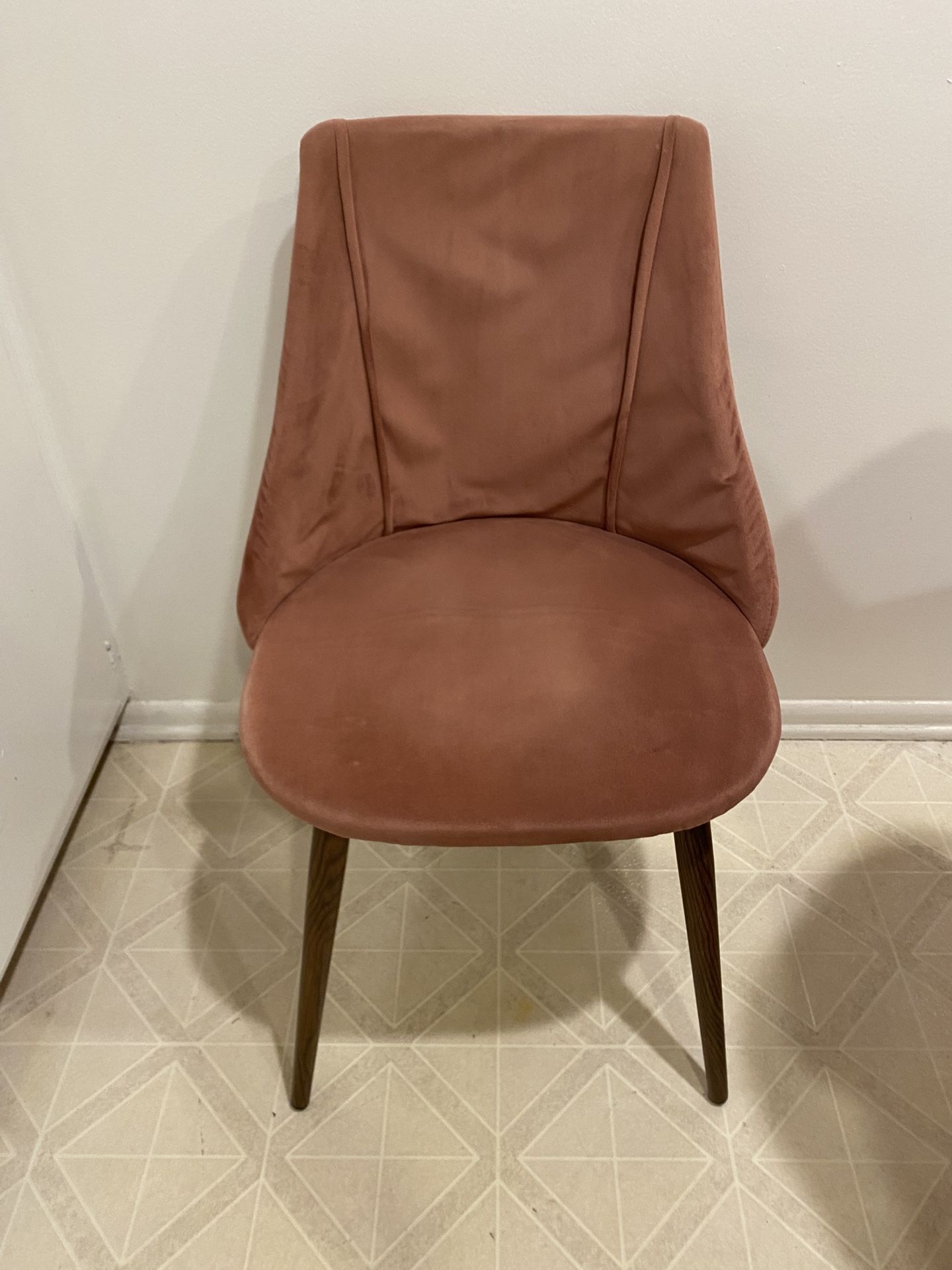 I have a set of 4 dining chairs in great condition! Lightly padded seats in a velvety milk chocolate brown colored fabric. Would go great with many styles. Clean lines, brown legs (these don’t unscrew just fyi). No tears or stains. The fabric cleans up easily with soap/cleanser and a sponge. Great chairs looking for their next home! Price is for the complete set of 4. Prob won’t respond to low ball offers just fyi.