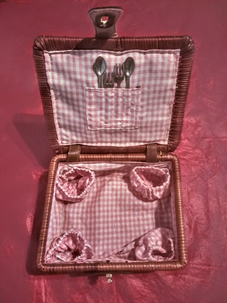 Miniature wicker picnic basket with a set of silverware. Great for use with doll play. Pockets for miniature cups and an area for plates. Please see all my other posts. All proceeds will go to Project Zawadi, a 501(c)3 nonprofit that provides educational opportunities to orphaned and at-risk children in Tanzania.
