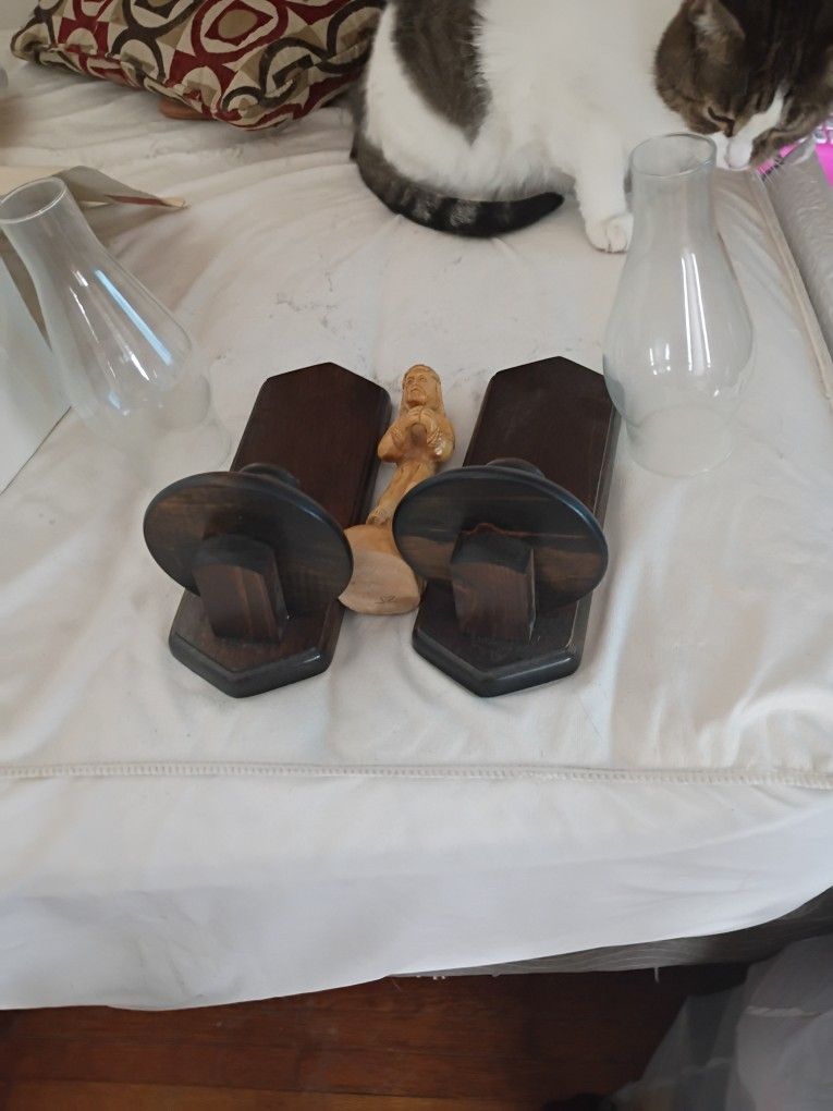 Brand new Wooden Wall Sconces Holders For Taper Candles SET OF TWO firm price $25 with a wooden Jesus pick up only 865 Ellsworth avenue right off of E