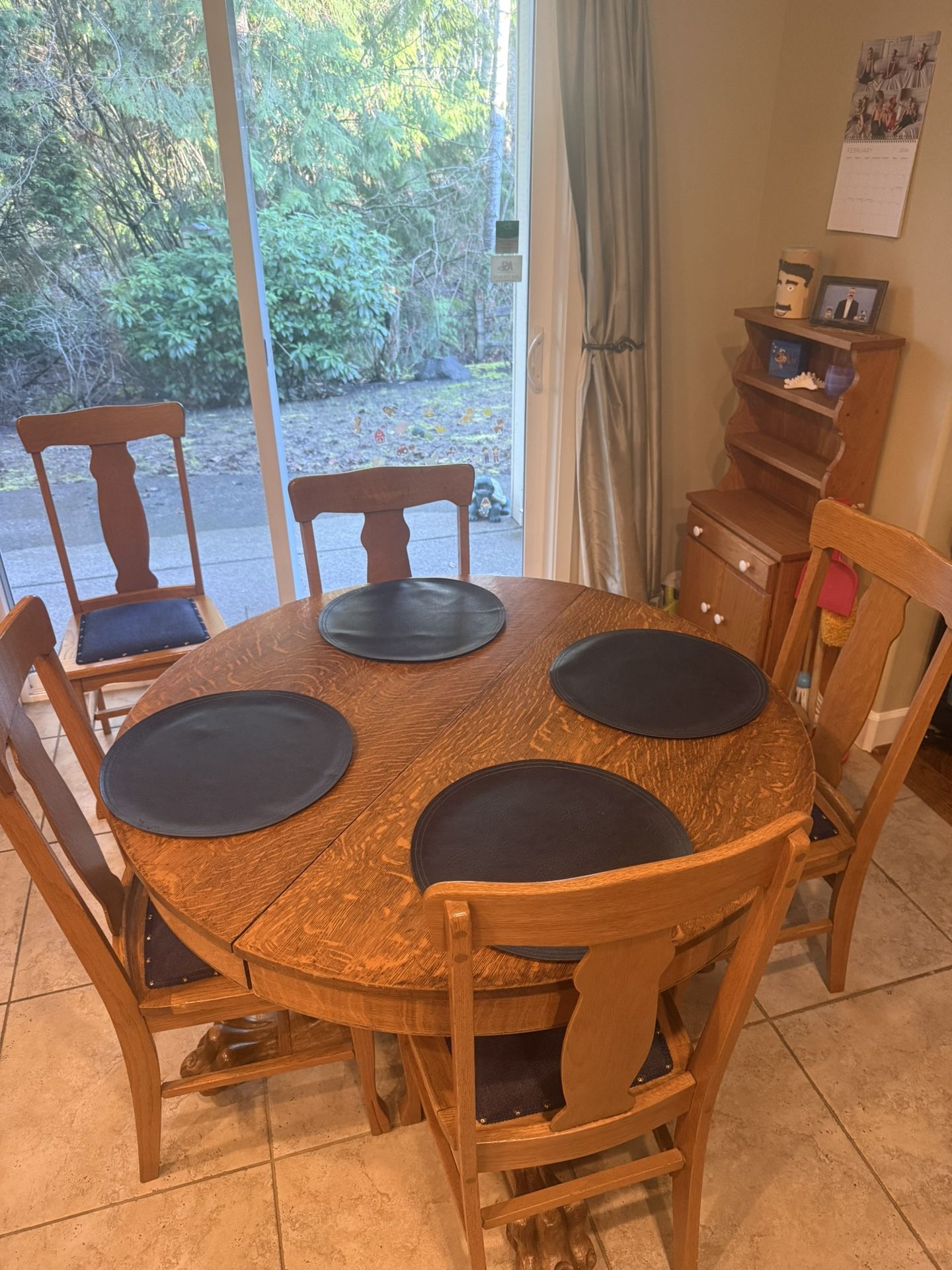 We live in Renton WA just above Valley Medical Center. Classic antique oak dining set. Has a round pedestal table with cool carved claw feet. Comes with matching chairs that have dark blue upholstered seats. Table has leaves so it can be extended for more space. Approximately 45 inches around with no leaves put in. Expands from approximately 45 inches to approximately 65 inches. Comes with six chairs with upholstered blue cushions. From Zophi App This style of oak dining table was popular during the late Victorian and Edwardian eras, roughly from the 1890s through the 1920s. American furniture manufacturers embraced quarter-sawn oak for its durability and distinctive grain pattern, while incorporating elaborate carved details like lion heads and claw feet to reflect the period's taste for ornate, substantial furniture. These tables were designed as centerpieces for formal dining rooms and often featured extension mechanisms to accommodate large family gatherings. Oak claw-foot tables remain highly sought after by collectors of American antique furniture and homeowners seeking authentic period pieces. The combination of quality craftsmanship, solid construction, and decorative carved elements makes these tables particularly appealing to those furnishing Victorian or Arts and Crafts-style homes. The dramatic lion head and claw foot details add sculptural interest that elevates these pieces beyond purely functional furniture, making them conversation pieces that bridge historical significance with practical everyday use.