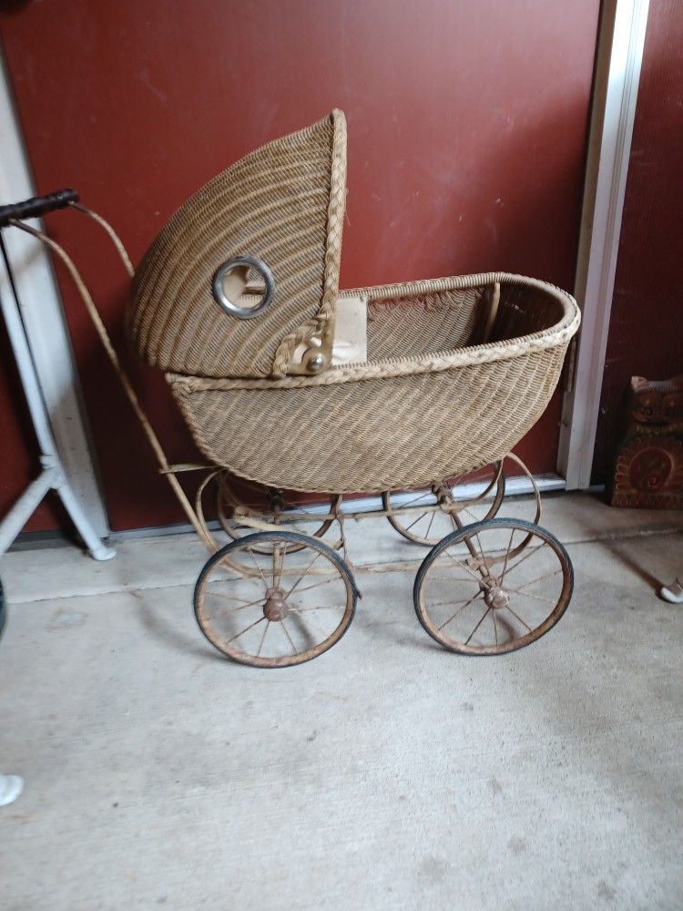 Stands about 29" high About 33" in length (from handle to end) About 12" wide Wicker cover swivels to cover 2 different ways Compartment located under where baby would lie Metal wheels Stand about 29" high About 33" in length (from handle to end) About 12" wide Wicker cover swivels to cover 2 different ways Compartment located under where baby would lie Metal wheels and rubber tires; believe it is a wooden handle Has brake lever, which presses on tires, but doesn't completely stop wheels from rolling. ......