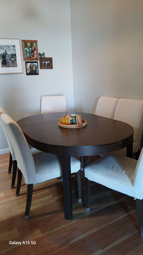 Extendable dining room table with 6 upholstered chairs. The chairs covers are removable and washable. When extended, the table is 65 inches long, by 40 across, and stands 29 inches high. I just bought this from someone a few days ago, selling discounted to what I paid it is a nice table, but just doesn't match my style as I hoped! Unfortunately I can't deliver it! $60