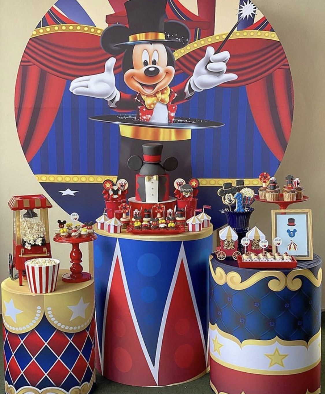 Beautiful circus Mickey Mouse party Setup includes Curtain backdrop Image backdrop Balloon garland 3 matching cylinder tables Cake stands Theme decor (Not included cakes, desserts, chairs, table, tents) you can add all at an additional cost