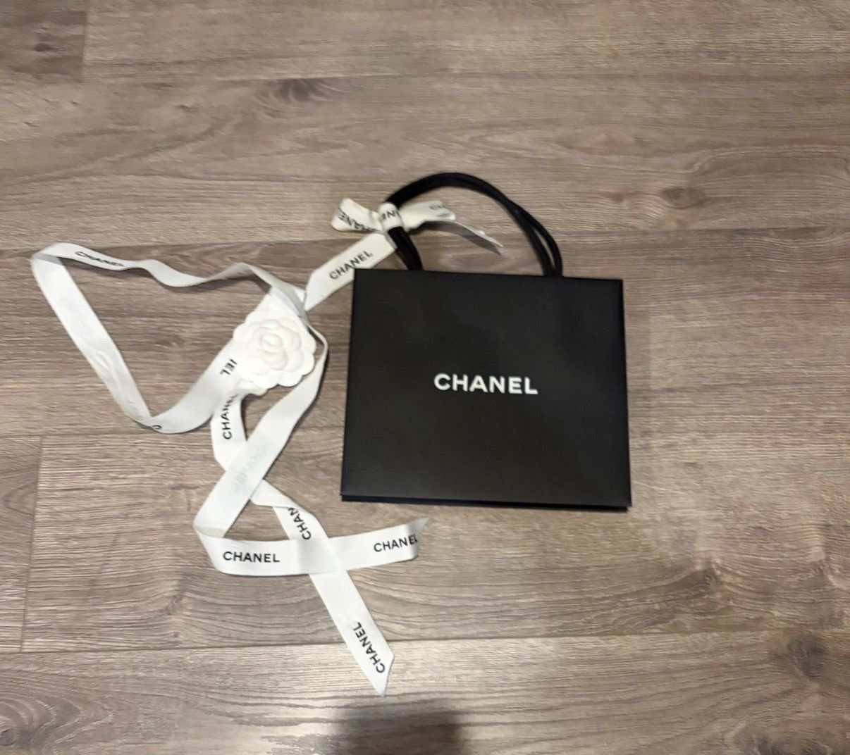 Comes with ribbon that measures approx 52 inches. Shopping bag measures approx 8.5x7.5x3