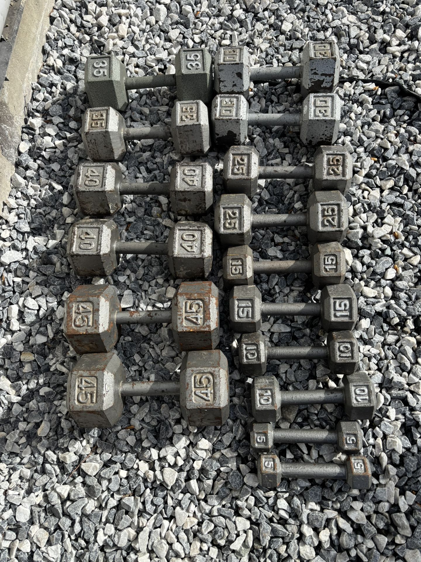 Dumbbells 2 x 5 lbs 2 x 10 lbs 2 x 15 lbs 2 x 25 lbs 2 x 30 lbs 2 x 35 lbs 2 x 40 lbs 2 x 45 lbs Total 410 lbs $385 firm Check listing for more gym stuff Keywords Weights gym dumbbells exercise squat rack weight bench dumbbell concept 2 rowing machine rower spin bike rogue crossfit power rack rogue bowflex water rower echo bike airdyne assault fitness treadmill elliptical bowflex max trainer Titan rogue