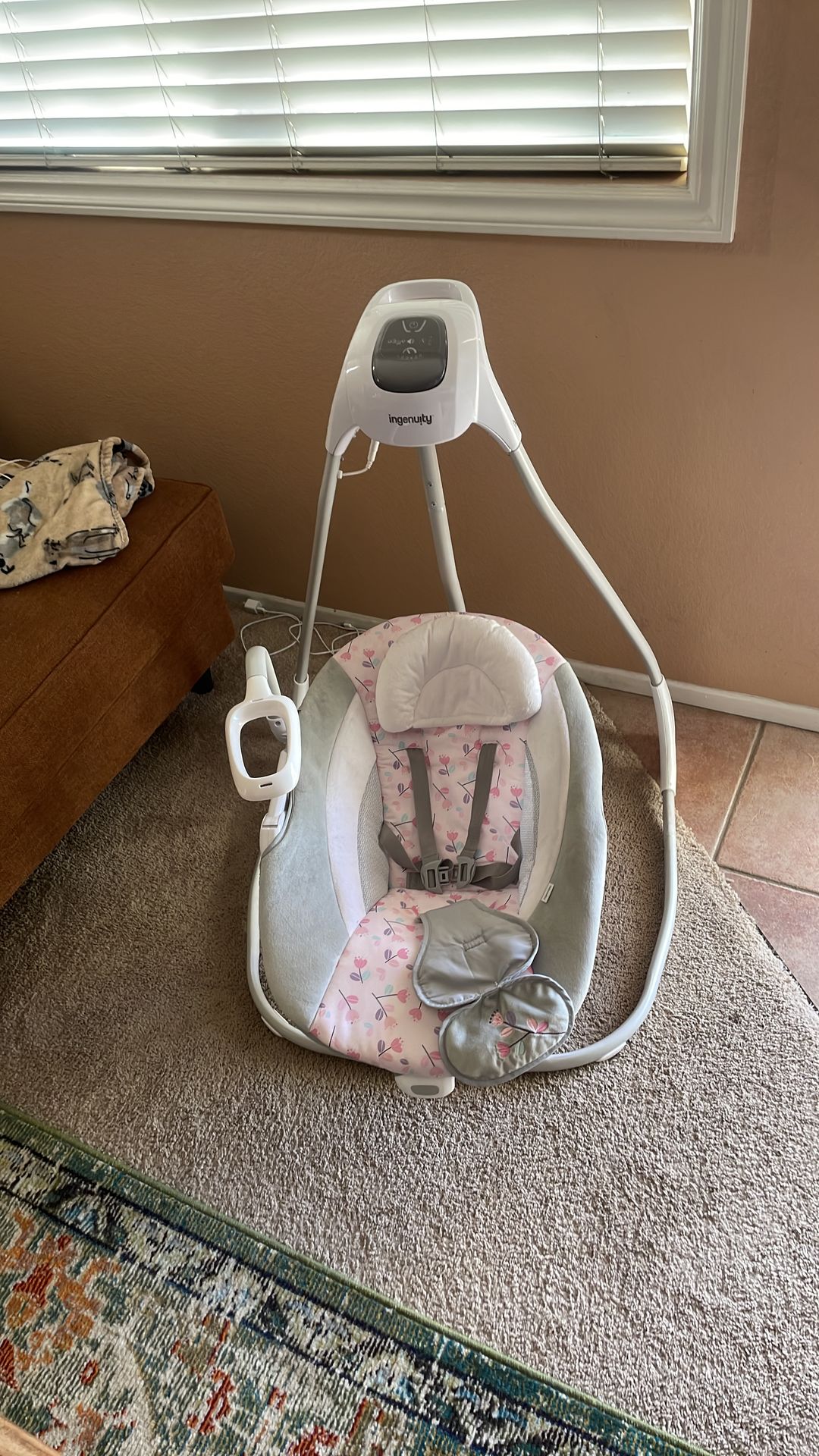 Ingenuity baby swing basically new, used only a few times. Motion is back and forth swaying with 6 speed levels. Nature and music option with timer of 15,20 and 30 minute options. Selling due to my baby not interested and not liking this.