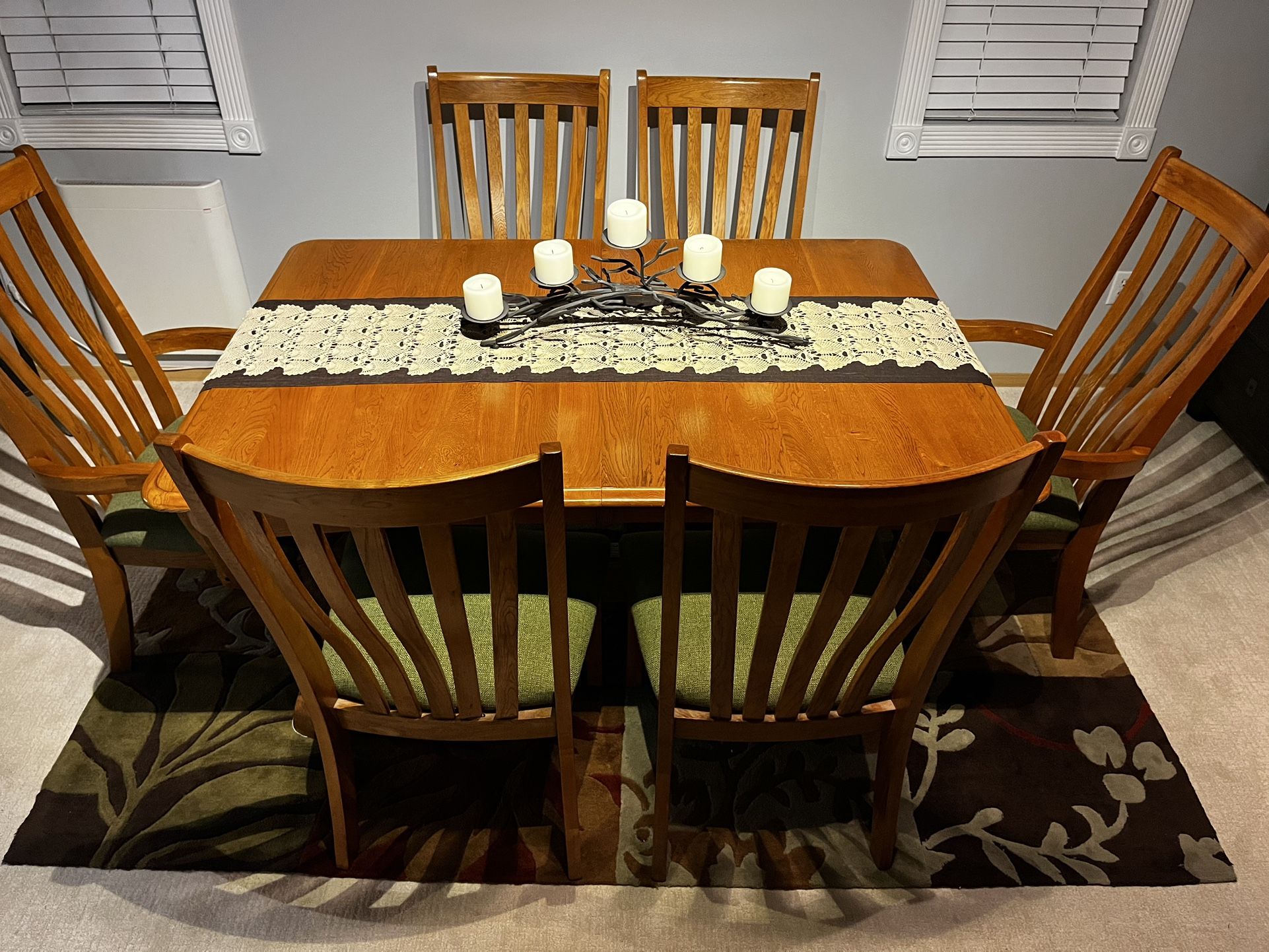 I’m moving. Must sell Beautiful rich tones, strong and well made. 5 ‘ by 3 1/2 ‘ by 29” tall. Comes with two, 18 inch built-in, hideaway leafs. So it expands to 8 feet! Six chairs, all reupholstered, clean, includes two armchairs. Double pedestal base, heavy, and super solid. Some nicks , a stain on the top and a broken leaf clasp, but works fine. You’ll enjoy this table for years to come. 😁