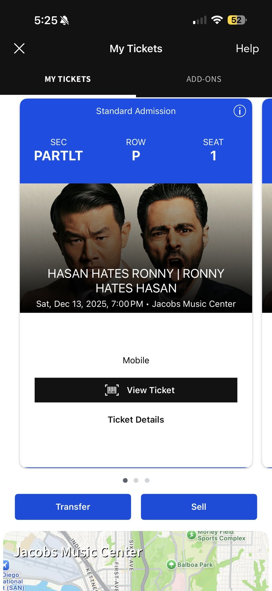 Two tickets for Hasan Minhaj and Ronny Cheng on Saturday December 13 at Jacob’s Music Center at 7:00 pm Row P, Seats 1 and 3. Paid $134.20 each. Selling for $120 each or best offer.