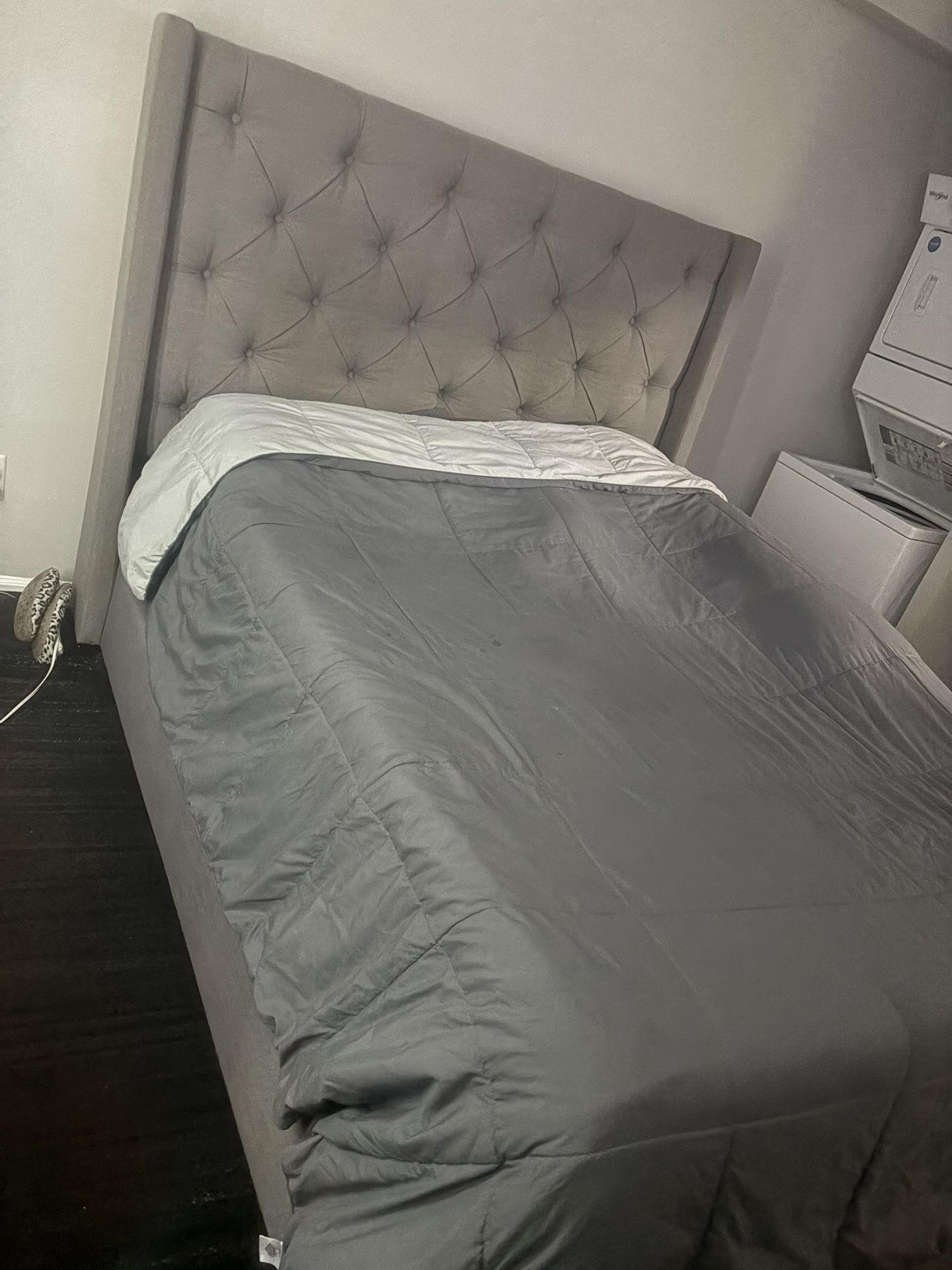 $400 for Frame Both Used but Fairly new, great condition, real wood, sturdy bed and firm mattress, need to get rid of ASAP due to relocation. Queen Sized Grey Upholstery