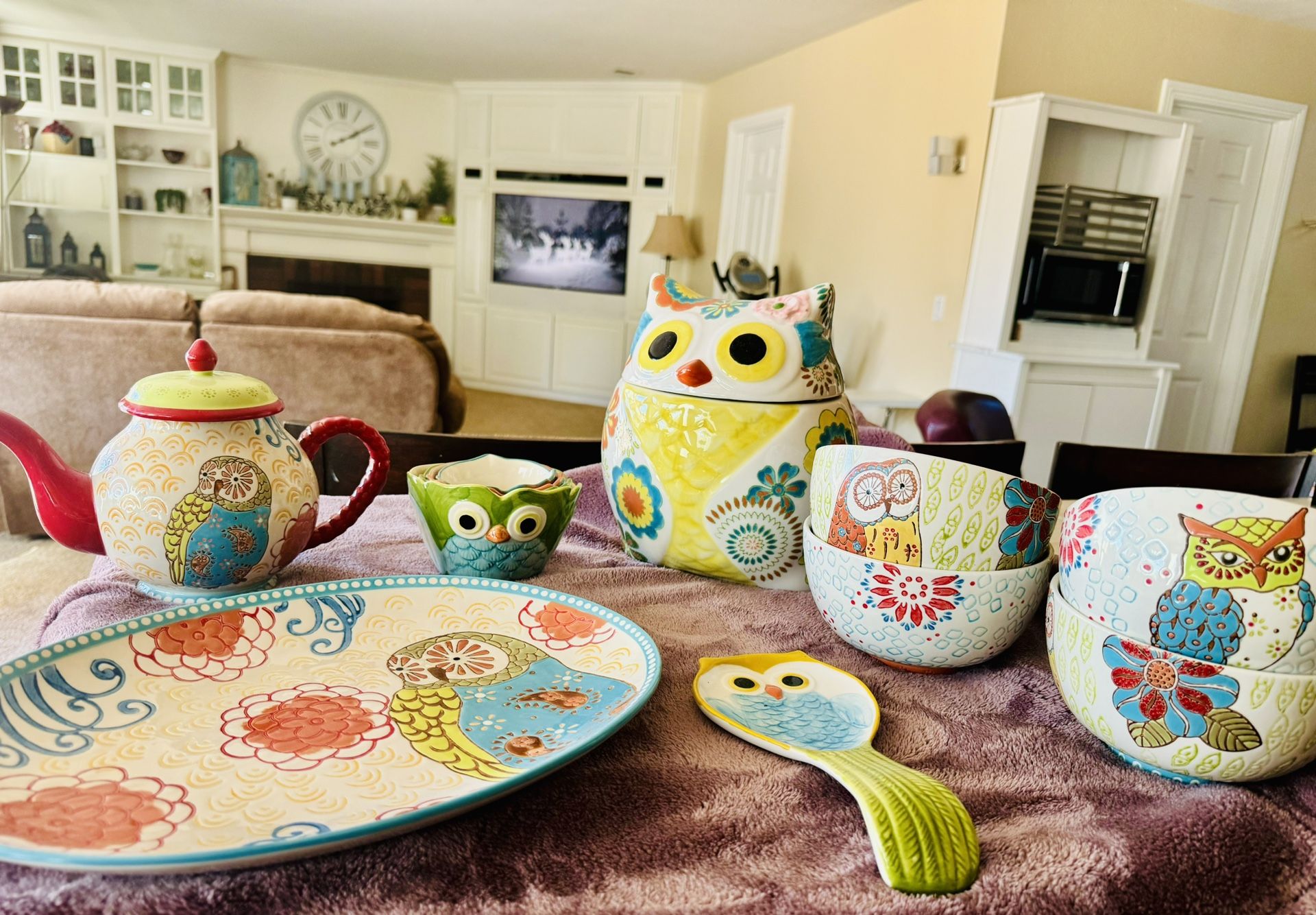 - Adorable “Owl” Kitchen Accessories - 14 Pieces - From Pierre 1 Imports - New and Never Used - Awesome Gift For Mom! - Cookie Jar, Teapot, Measuring Cups, Spoon Rest, 4 Dinner Bowls
