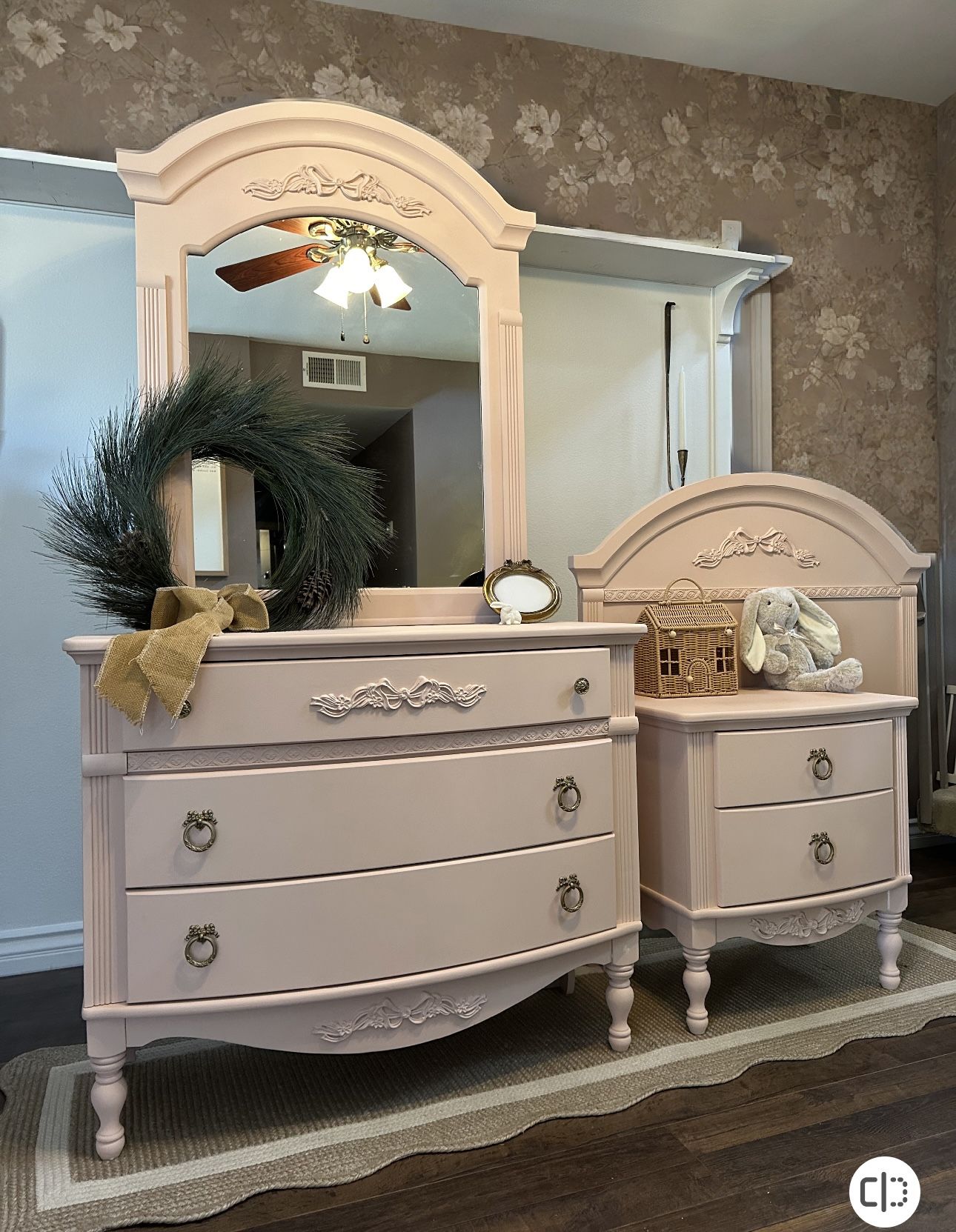 This gorgeous bedroom set has been professionally refinished in a warm, muted, light beige-pink with dusty undertones and sealed for lasting durability. Each drawer has been lined in a soft floral print. The set is soft, elegant, and timeless. Head board comes with a bed rails. Size: twin Headboard: 42.5”W x 46 5/8”H 3 drawer dresser: 40.25”W x 32”H x 17”D + Mirror dimensions: 34.5” W x 43”H 2 drawer nightstand: 24.25”W x 25.25”H x 16.5”D