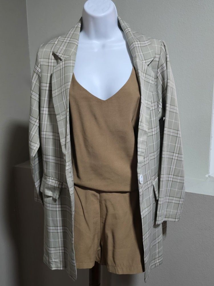 3 pcs short set, top has adjustable strap and short has garterize waist in the back, blazer & short has pockets. All my clothing is "NEW" i use to do "Live selling online" but it's now closed! Just selling all my clothing low price. Please check my other listing for more clothing. Thank you.