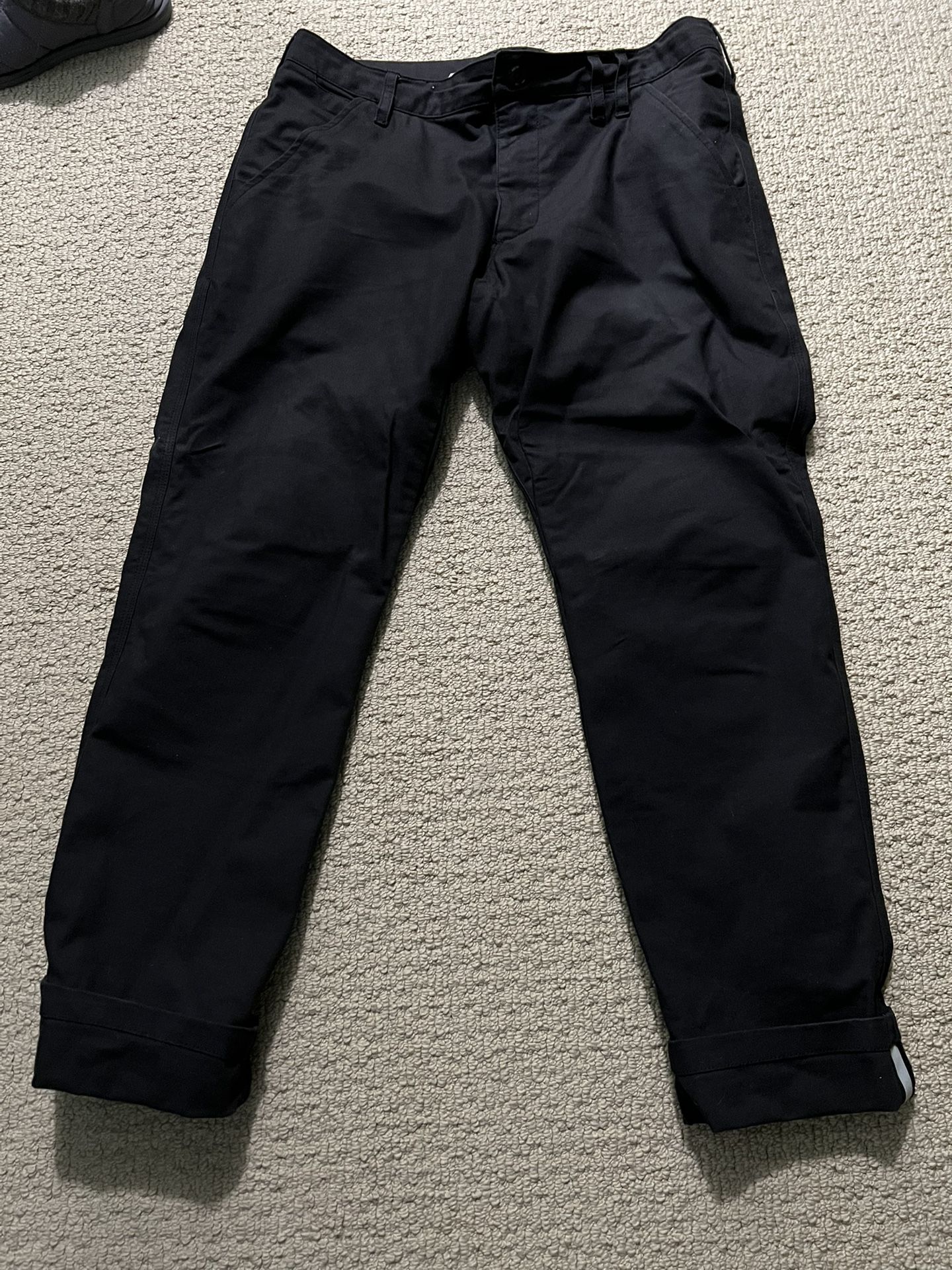 barely worn rev’it alpha riding pants. these pants do not look like riding jeans but still offer the same level of protection as their riding jeans. bought them a while ago but barely worn them. maybe 2-3 times for my commute to work. size 34. don’t remember the length but you can fold the legs up to expose a reflective strip on both sides.