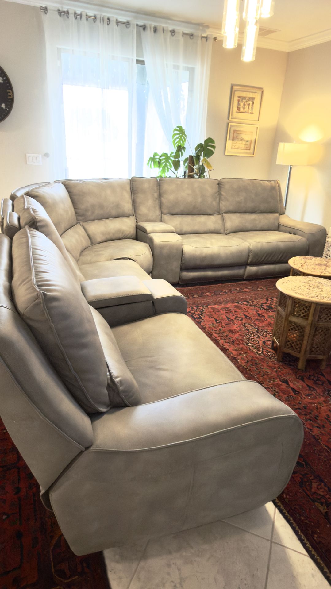 Huge, super-comfy grey sectional in great condition. Perfect for movie marathons or the ultimate man cave/basement setup. • Features: 3 reclining seats + 2 storage consoles with cupholders. • Color: Neutral light grey (fits any decor). • Condition: Well-maintained, clean, and everything works perfectly. • Design: Modular pieces make it easier to move and transport.