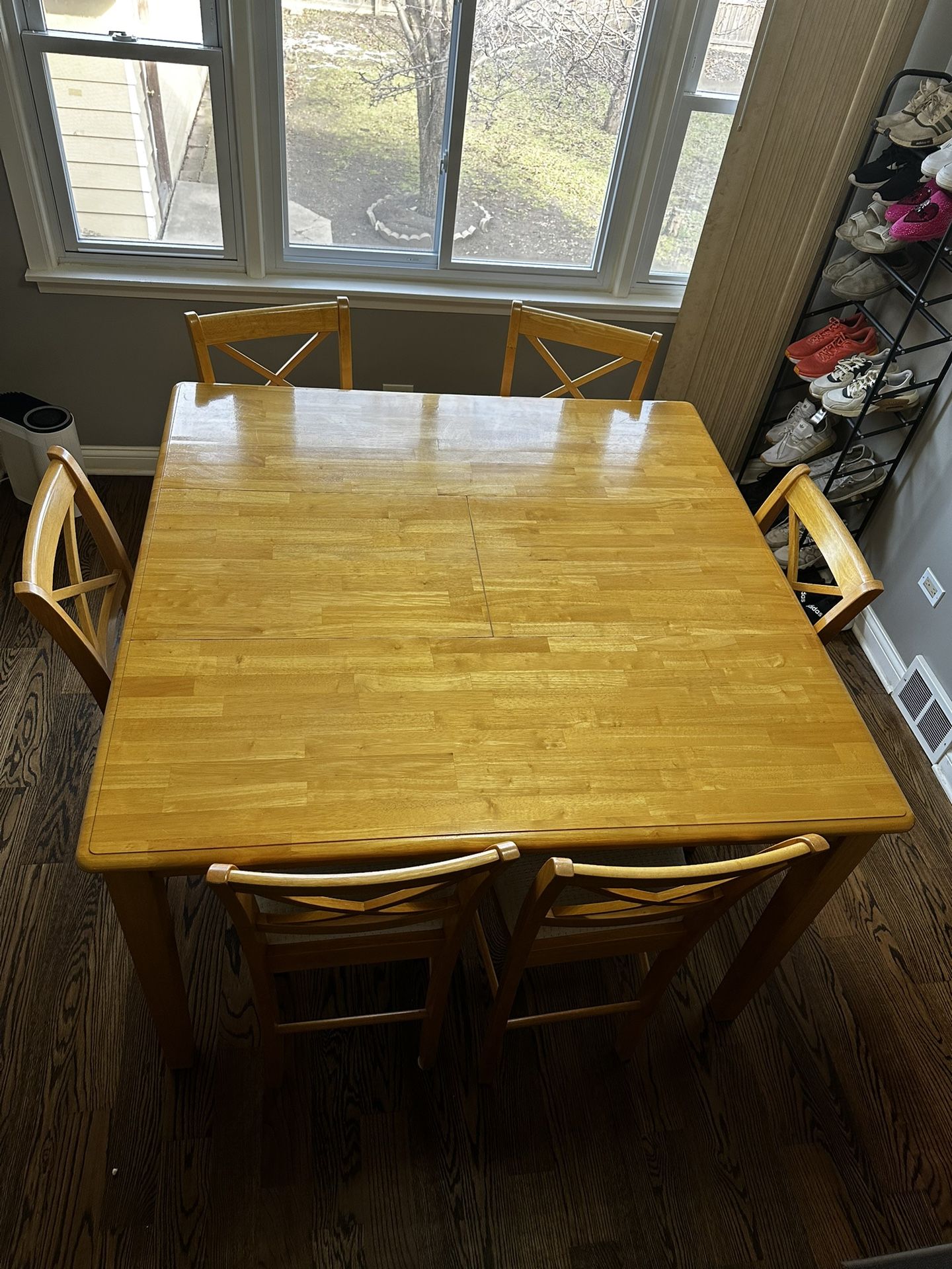 We had this lovely table for a while Table it made out of real wood so it’s semi-heavy Very durable very well kept as shown in photos Comes with 6 chairs Table does fold in the middle to make smaller or bigger as shown in photo 5/6 Measurements are in photo Accepting reasonable offers Will come dismantled for easier pick up