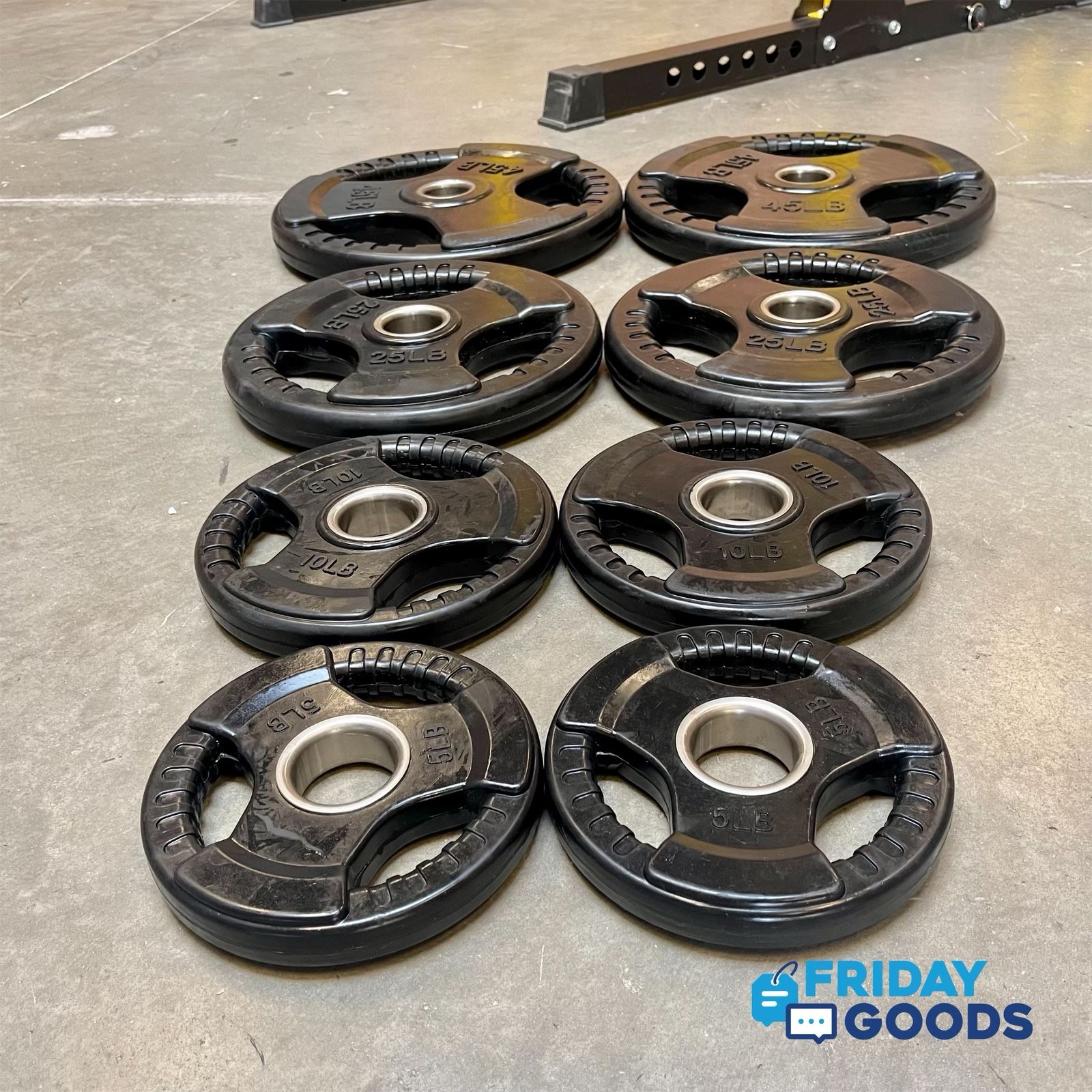 *please read entire listing** $250 cash out the door. Free delivery to most of San Diego Any other form of payment is plus tax. If paying with credit card price is plus tax. Come schedule a visit in our showroom in Chula Vista (eastlake) or purchase on our Website. Brand new in box!!! Payment: cash, credit, debit, Zelle, Apple Pay Sorry not negotiable. Photo is a floor model, what you get is brand new in box never opened. I sell other new gym equipment, click on my profile to see what I have in stock. Product information 170 lb Olympic grip plates Commercial quality!!!! SPECIFICATIONS Plates are rubber coated, cast iron in the inside. * (2) 45 lb * (2) 25 lb * (2) 10 lb *(2) 5 lb Returns will be accepted with proof of purchase, if the item is unused or unopened if applicable within 30 days from date of purchase. A restocking fee of 10% per item will be assessed. FridayGoods LLC provides manufacturer warranty of the above item(s) for a period of three months from date of purchase listed on this invoice. This warranty covers the repair or replacement of the broken product(s) at our discretion. This warranty does not cover wear and tear and/or accidental damage. Warranty will be void if this invoice is altered in anyway. Weights, home gym, dumbbells dumbells, CrossFit bench press curl bar fitness yoga cardio strength Squat rack cable machine Adjustable incline decline press handles Olympic bar bars free weights barbells barbell cable work out pulley system abdominal straight military press shoulder leg cast iron elliptical cardio treadmill cage set hip thrust exercise equipment lunges weight plates set bumper plates