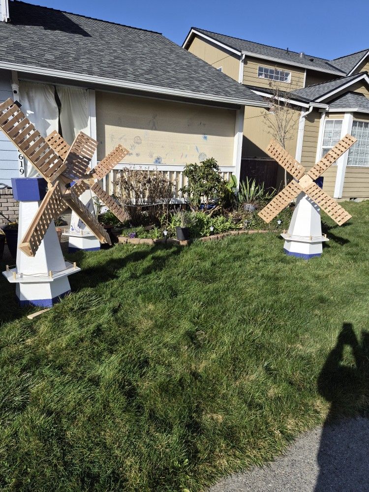 Over the winter my husband built them and i painted them. They are 6ft tall. Sails can be removed and spin like a charm but they are heavy. We can help you load them but you may need help unloading. 2x outdoor wood seal coat. 2x coats of white and blue paint. We have 2 for sale at $800 each. You pick up. Cash only-scammers asking to pay in advance will be ignored. ***Delft painted windmill not for sale.***