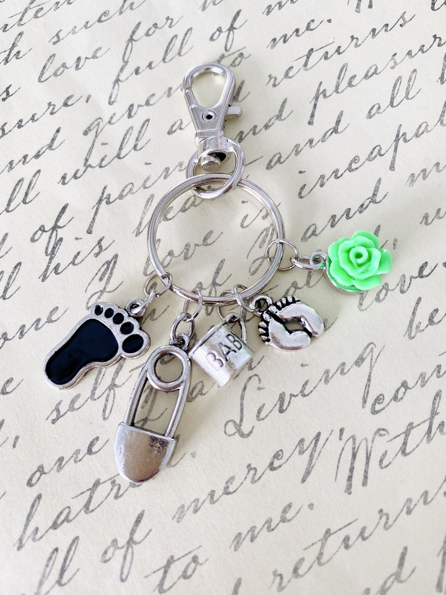 Handmade Baby Keychain. Great gift for baby shower. Please see photo for dimensions. All of my items are Lead-FREE, Nickel FREE, Hypoallergenic & and from Smoke-Free home. If this is a gift, I can add a special note card along with the items at no extra cost, just message me with your message. Keychain comes in a small kraft gift box.