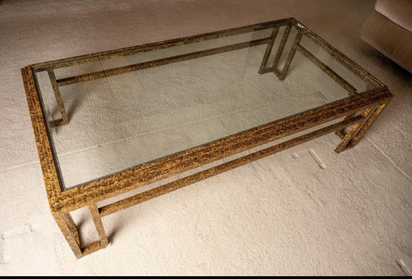 Add a stunning vintage statement piece to your living room. Features a clear glass top and open base to keep your space feeling large and airy. Key Details: * Style: Hollywood Regency / Boho Glam * Frame: Striking geometric metal base with a unique mottled bronze/gold finish * Top: Large, clear inset glass * Dimensions: 60" L x 30" W x 16" H Logistics: * Cash only * Location: Pick up only in Escondido